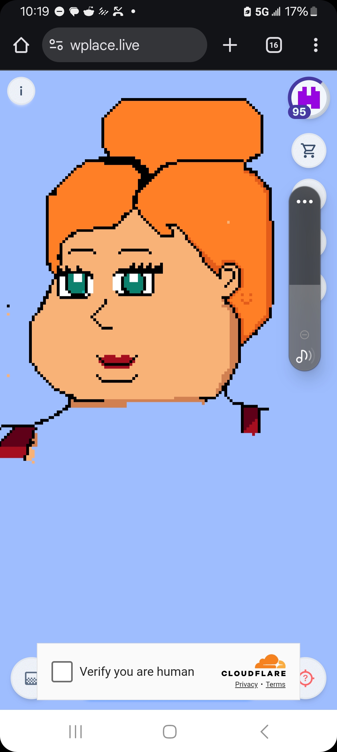 https://wplace.live/?lat=31.98161465888226&lng=-96.93202181572266&zoom=12.709848463017176 I am TRYING trying trying to keep her together, but it's a daily affair, this gal, terribly needy and the griefing doesn't help either. Worth it for that super-puffy chin, though.