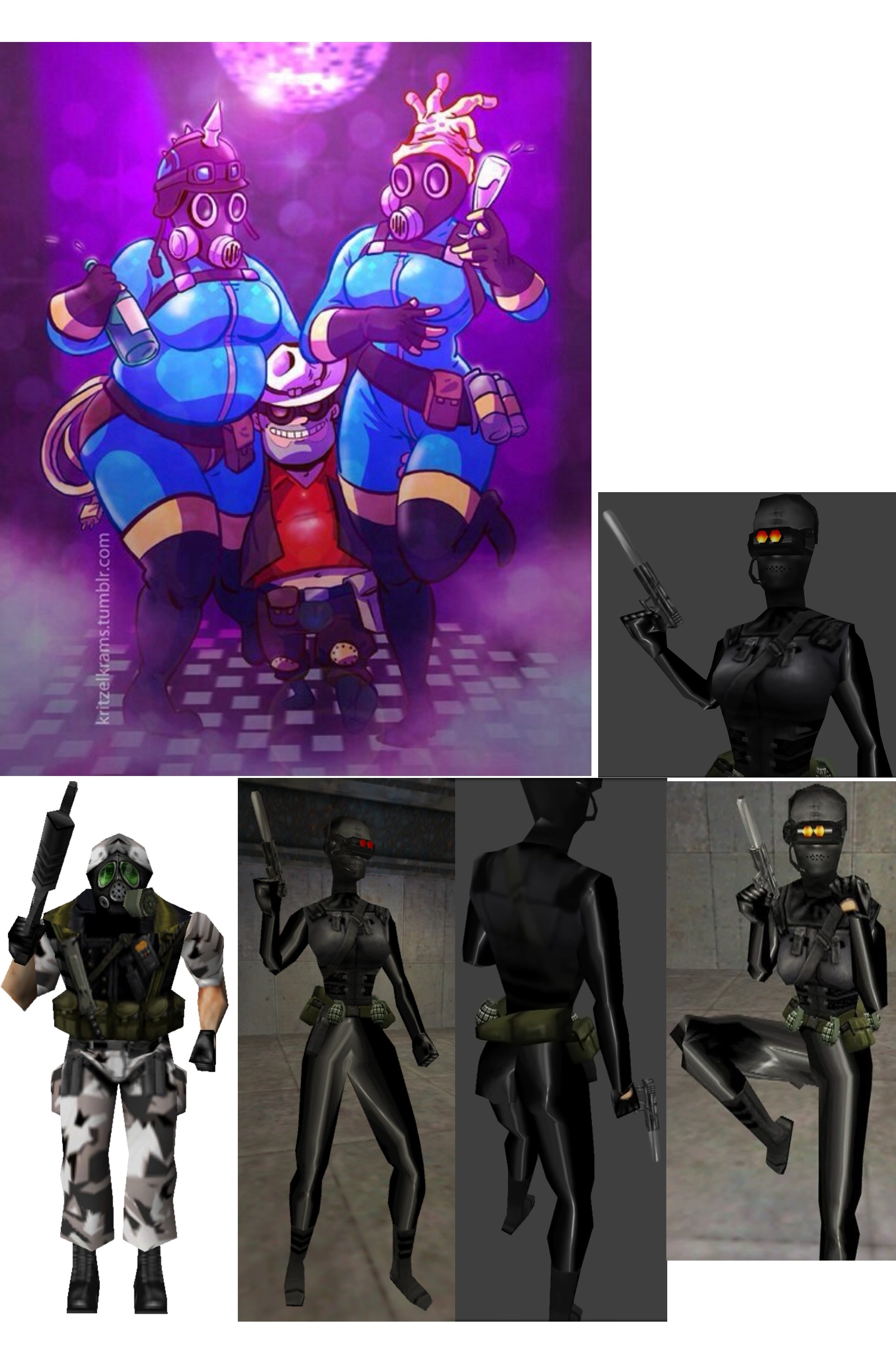 >>279514 Requesting the two Half-Life female assassins (same as the pyros in the ref, one fat, one slim, same two body types, but no hats) hanging out with a HECU soldier in the middle (comically short like the engineer in the ref).