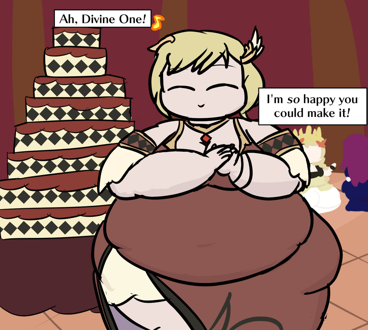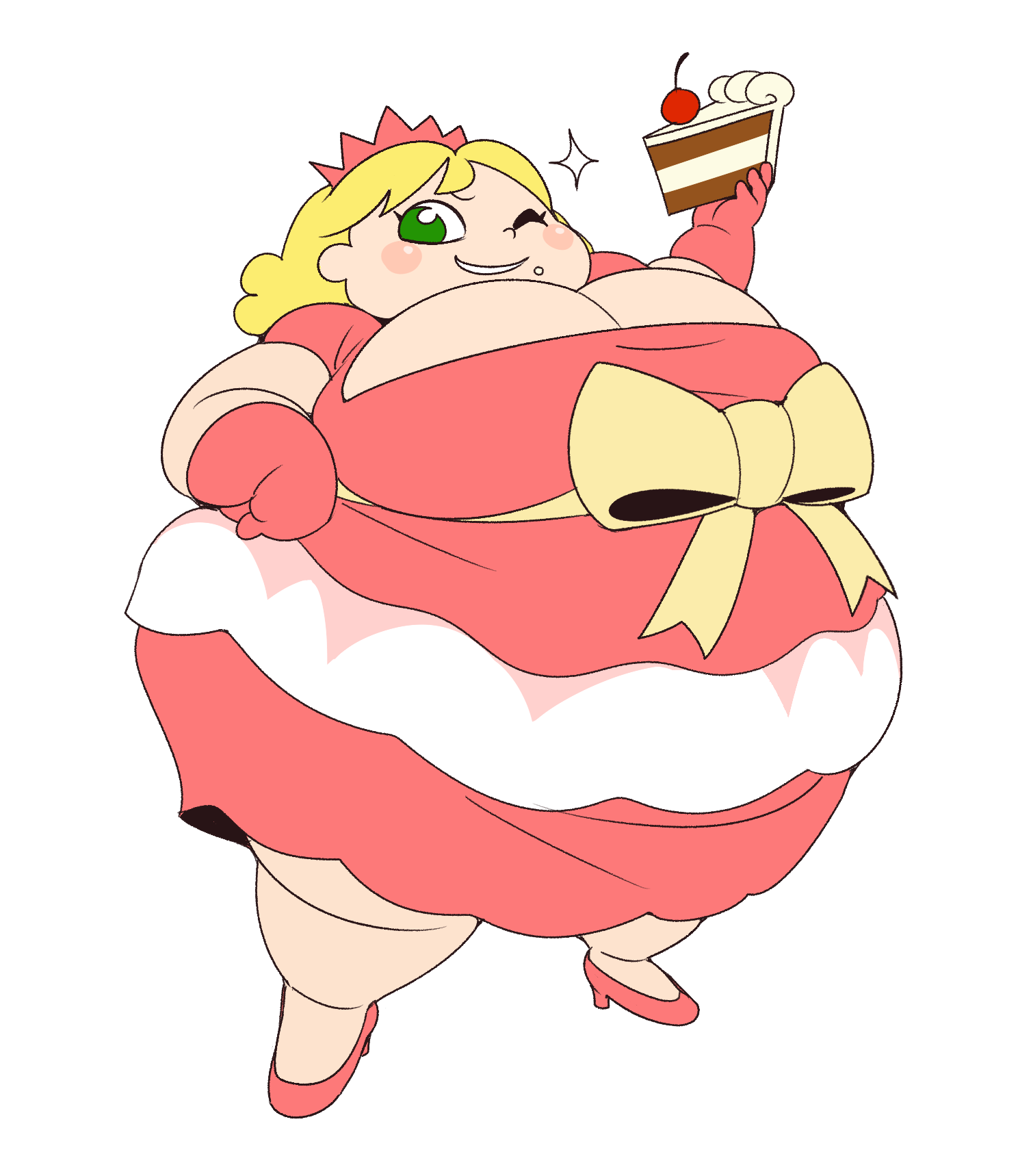 >>279514 Requesting Fat Princess from the eponymous game as obese as the woman in the second image; but blushing, with hands and feet sunken, bigger cheeks, bigger lips and with a piece of cake wedged on her cleavage.
