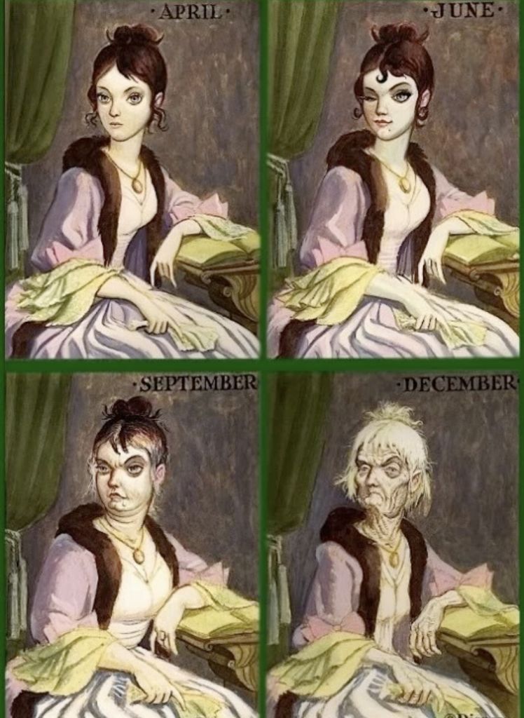 Requesting December portrait of Miss April-December from the Haunted Mansion but instead of an old Hag, she becomes a smoking hot BBW MILF with huge saggy tits and bold grey highlights in hair