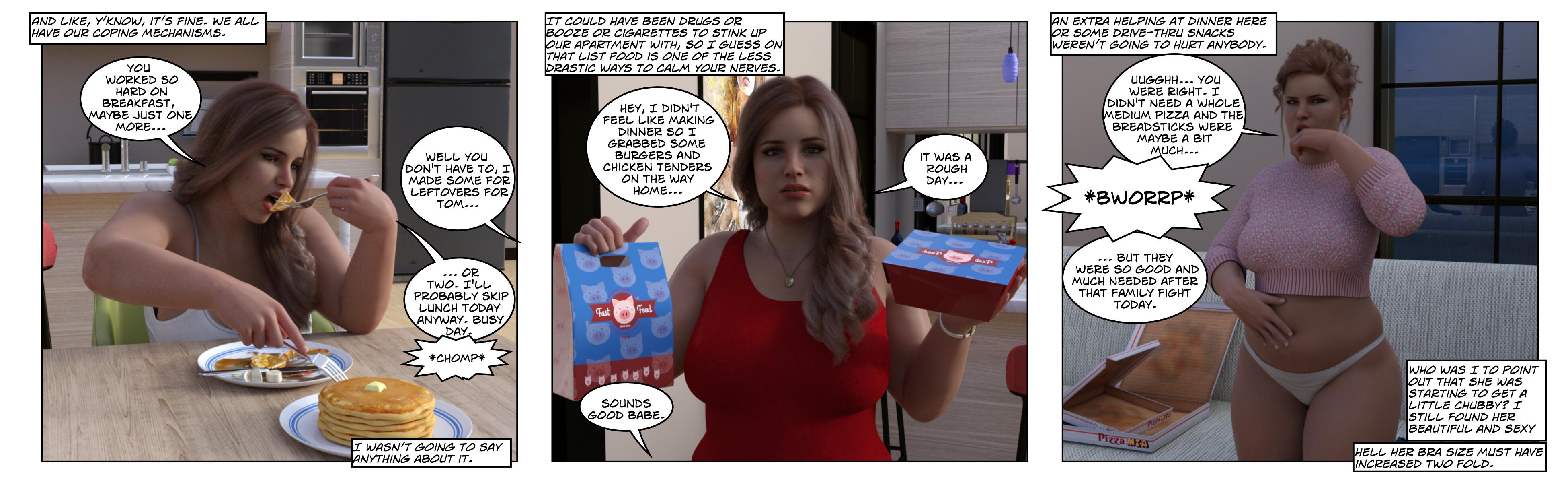 I hate how much text his comics have. Comics are suppose to have just speechbubbles or small notes saying the time and not fucking full paragraphs. The pacing is also shit where the weight is barely noticable until the end where it randomly speeds up and then the character goes from chubby to obese in like 3 of the final pages
