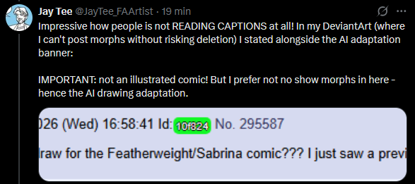 >>292402 Just has HUGE self-righteousness vibes. When his morphs were taken down off of Deviantart he complained that it was the "POLITICALLY-CORRECT POLICE" who were taking him down. Doesn't even have morphs up on his Patreon for the same reason(despite the fact that DeviantArt and Patreon are not the same people at all). You have to wait until he sends you a link to his Google Drive for his morphs. He talks and acts like he's on some great struggle against the forces of the "POLITICALLY CORRECT" and that accessing his morphs is a treasured thing. And he even talks about using AI to make his morphs on his Discord server, so he doesn't even MAKE the stuff people are paying him for. >>292441 Oh, 100%. I just don't know if it's JayTee or just some overenthused fan.