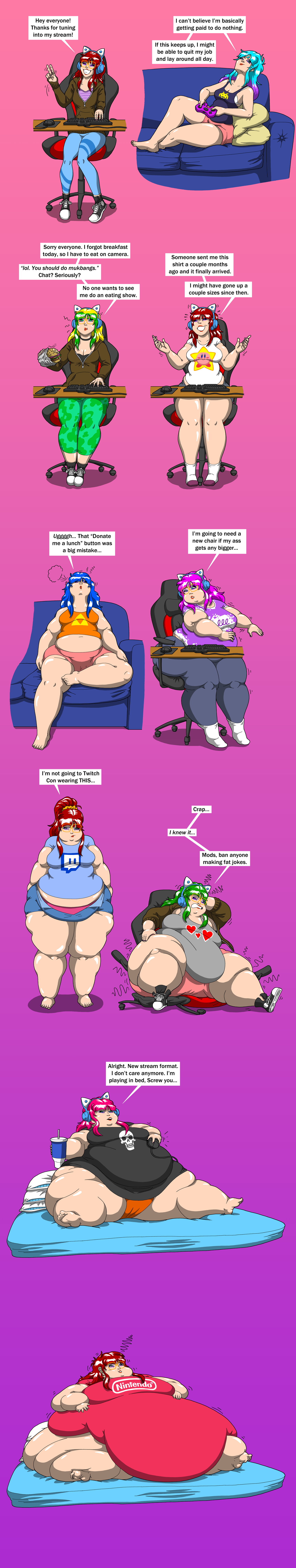 My gf is close to the stereotype as I've actually met, 430lbs+ (the scale maxed out) doesn't leave the house for months at a time, survives primarily on nuggies and milk, plays league of legends /Overwatch and sleeps all day. I've attempted bringing up the idea of gaining more but sadly not much luck, she could be truly massive if she just embraced her greed, but I obviously don't want to ruin a good thing
