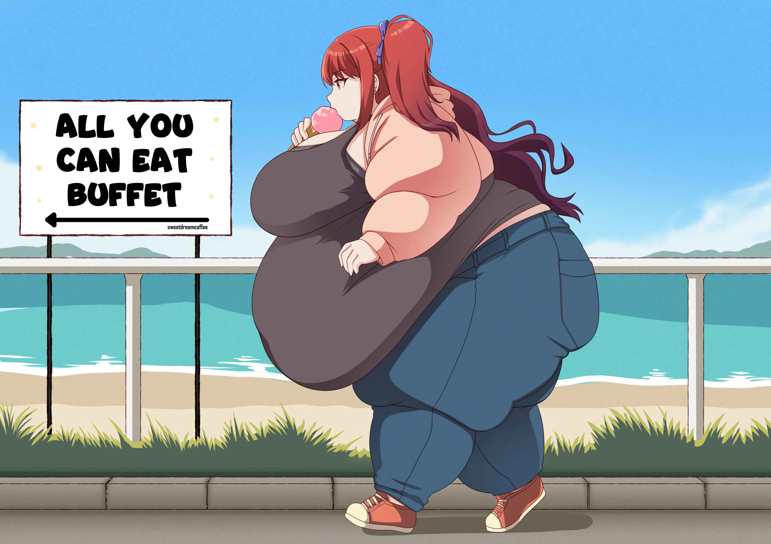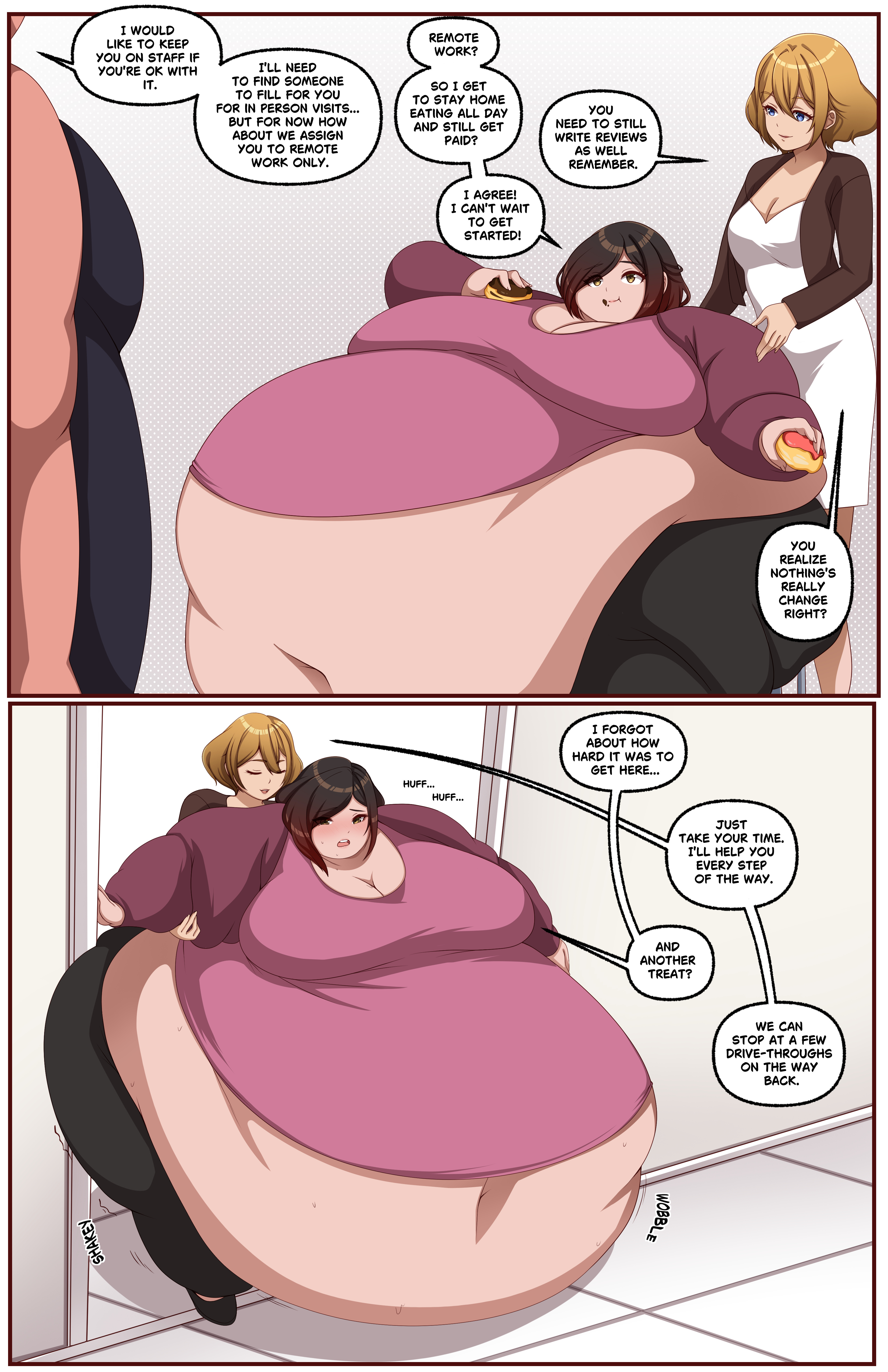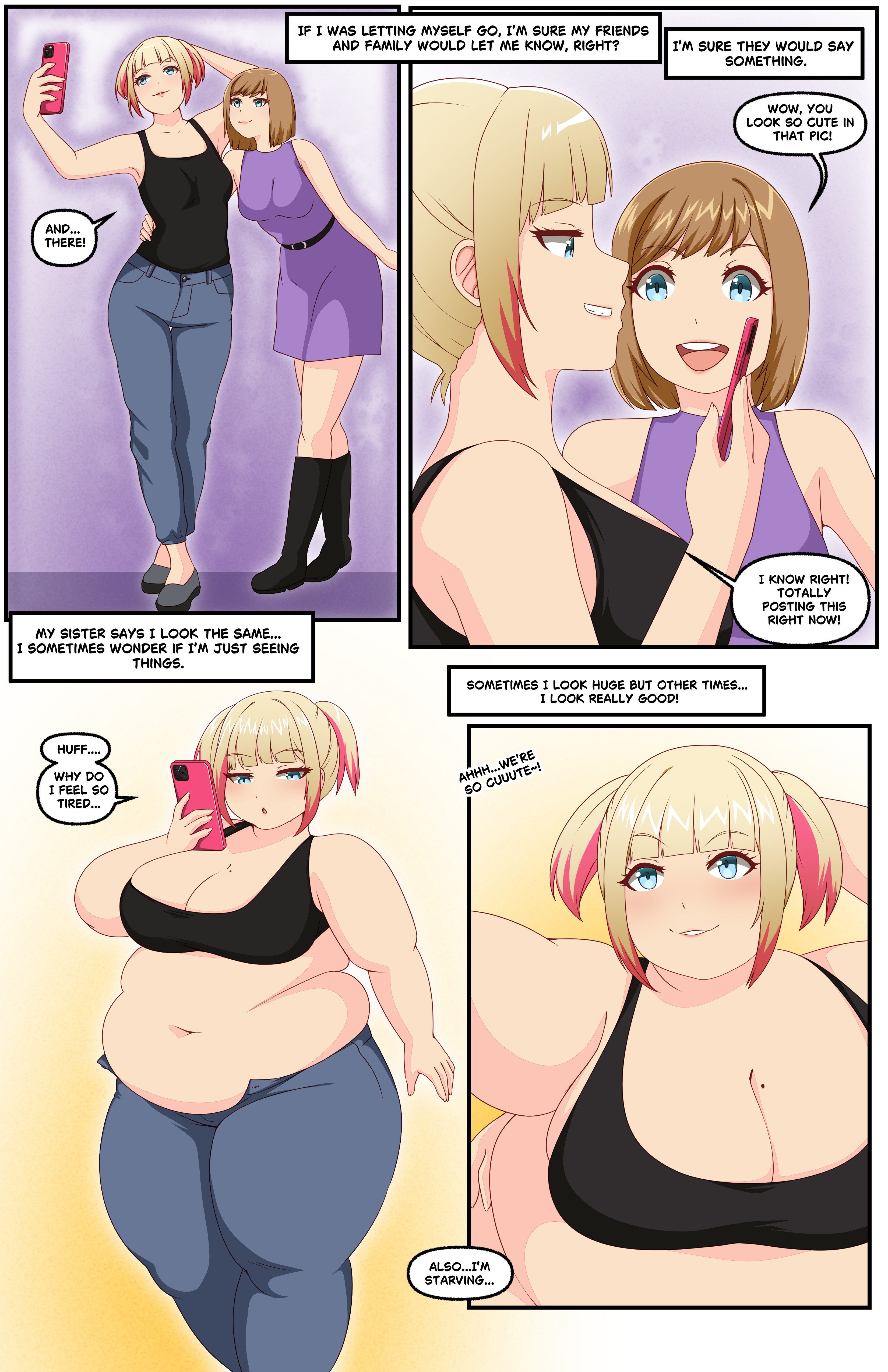 I hope the next pages show Selene being horny from her size. I like her getting bigger, but its kind of boring if she is just eating and being zoned out. Seeing a girl blush and trying to finger herself with one hand and begging for more for food while shes holding a piece of cake in her other hand is way hotter to me than a girl just looking dazed and sucking on a tube. Or at least show her two friends getting horny from feeding her/themselves