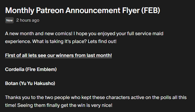 Anyone else on the patreon, because I'm extremely confused by the two "winners" of the polls. There were two polls, yet both winners were from one, and neither had more votes than Ann from Persona 5 on that poll. The other poll was a tie between Invisigal and Aqua, so... is SDC just lying and hoping no one notices or am I missing something?