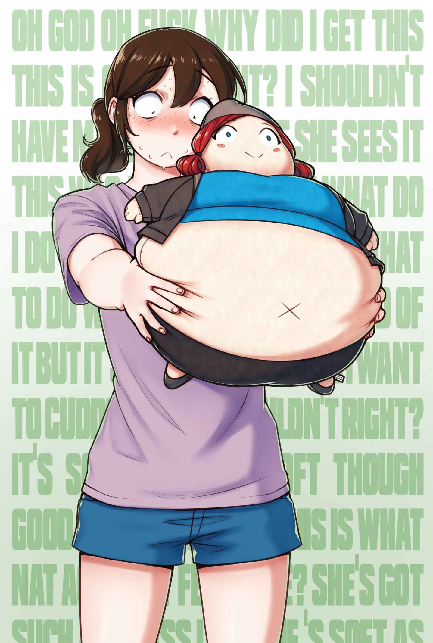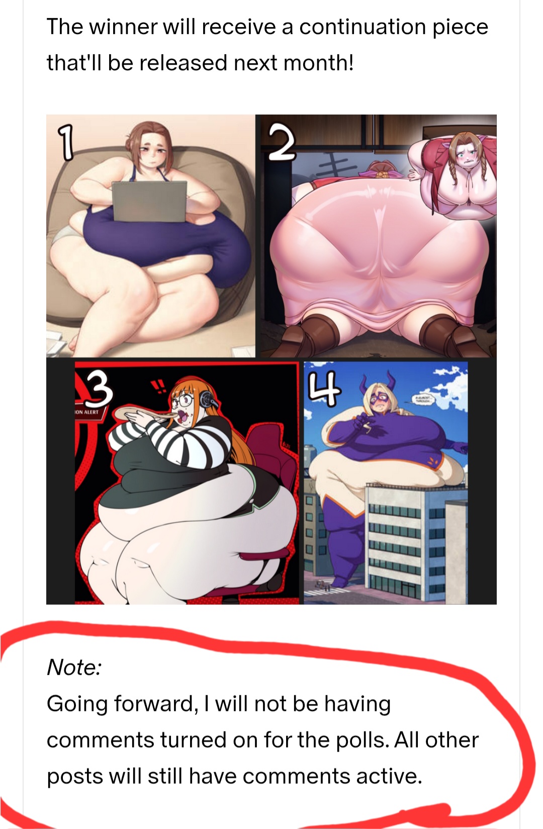 >>292307 >>292326 >Ive heard he claimed his ocs would never be immobile on this site, but when did he say it himself? Not saying it isn't true, im just curious. First I'm hearing of this, but that would make sense for how much teasing he's done with a few of his girls without ever committing to it. >Halie's dream about her teasing Nat soon not "getting around" at all. >A blobface of Val, along with 2 separate artworks having her being near the end of her mobility, one of which is called "The Last Stand". >Selene in various parts of the Beach Bod sequence. Part 8 having her say that she doesn't think she'll fit in the shower again, Part 9's description questioning how she got into the car and how she's going to out, Part 12 has her asking for lunch when she only stood for what sounded like a few seconds. >Courtney's enthusiasm about gaining weight for Shannon, and her overall confidence of being fat.