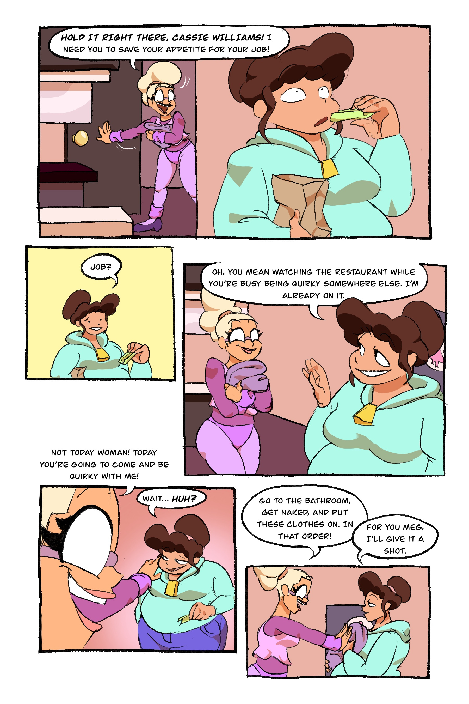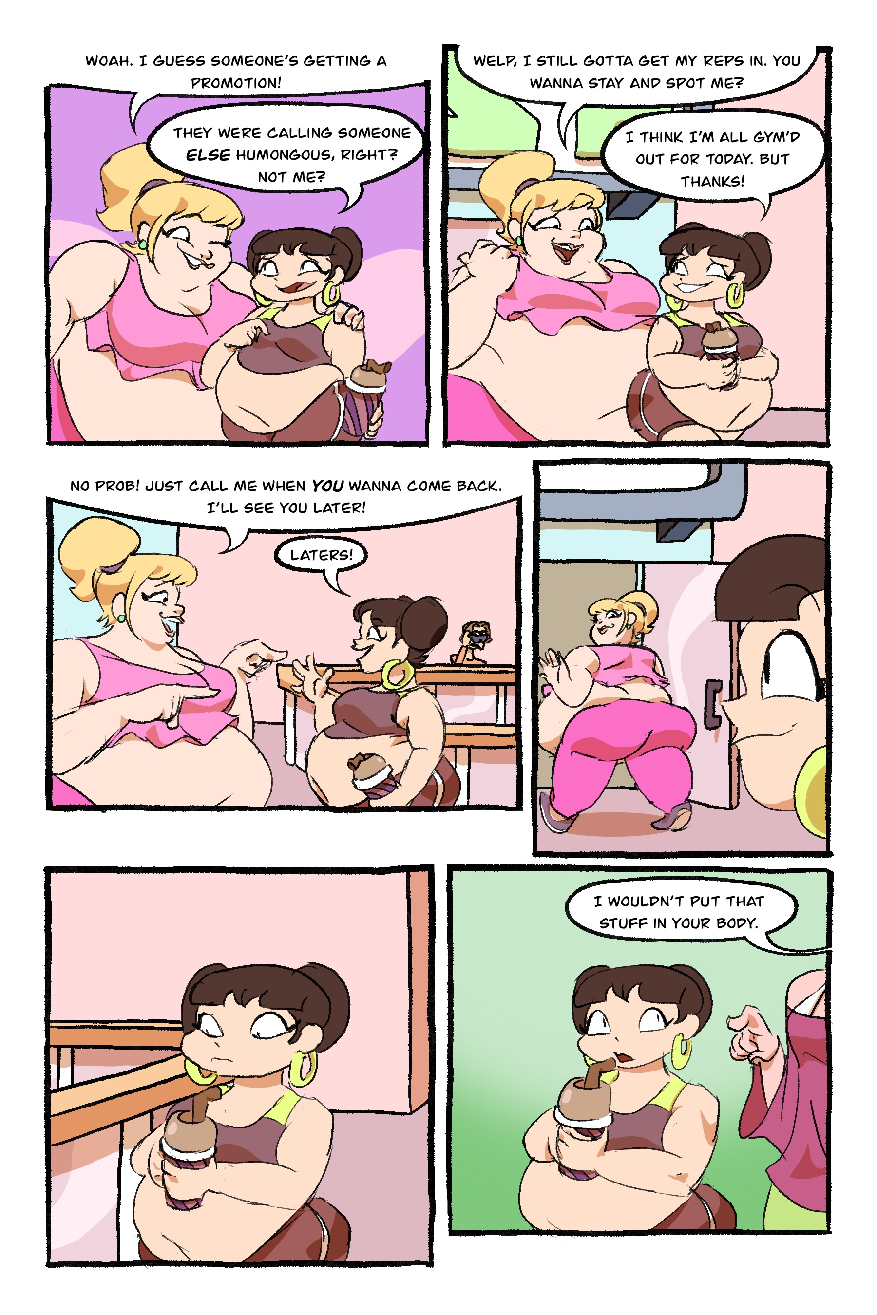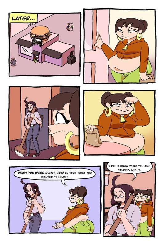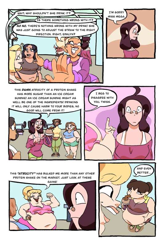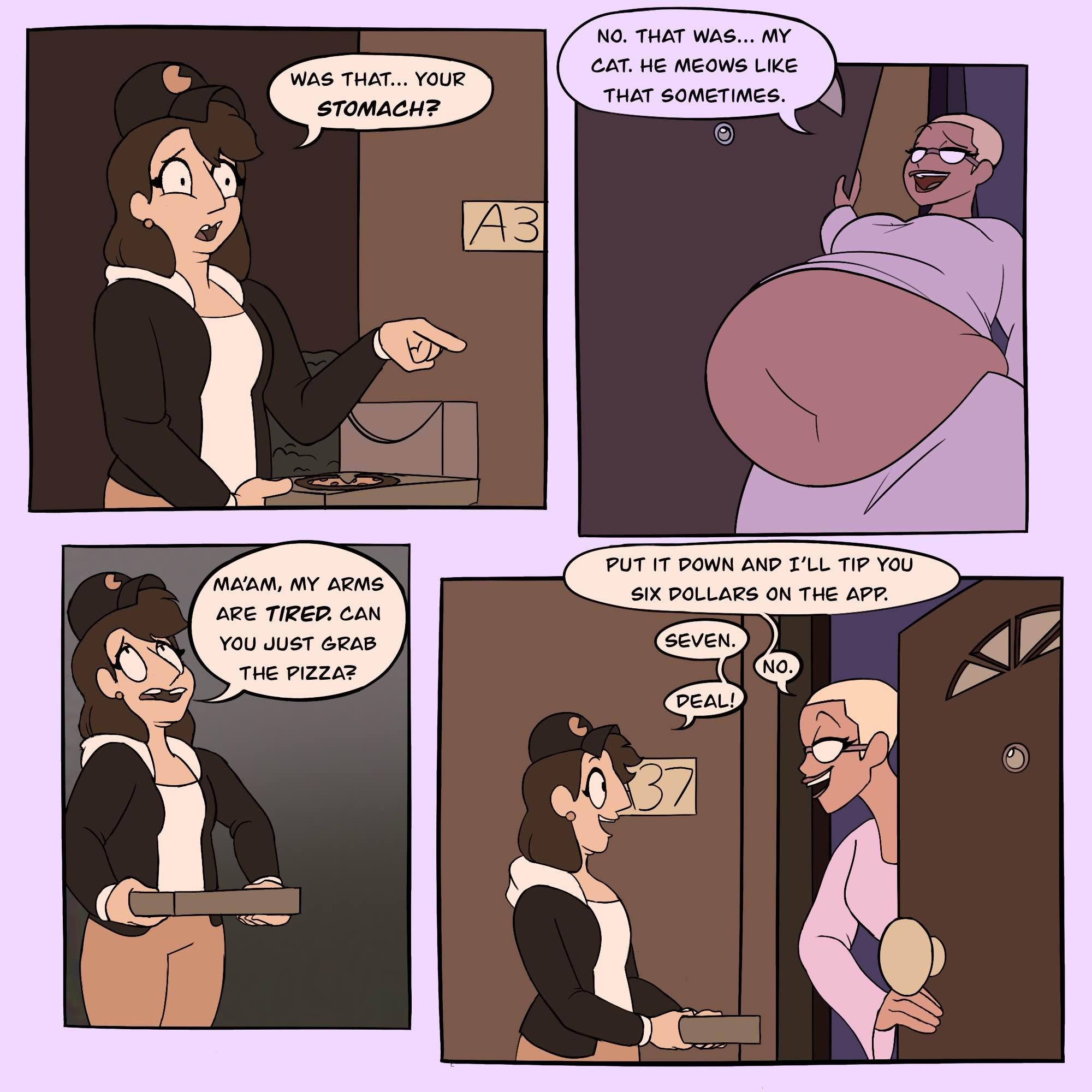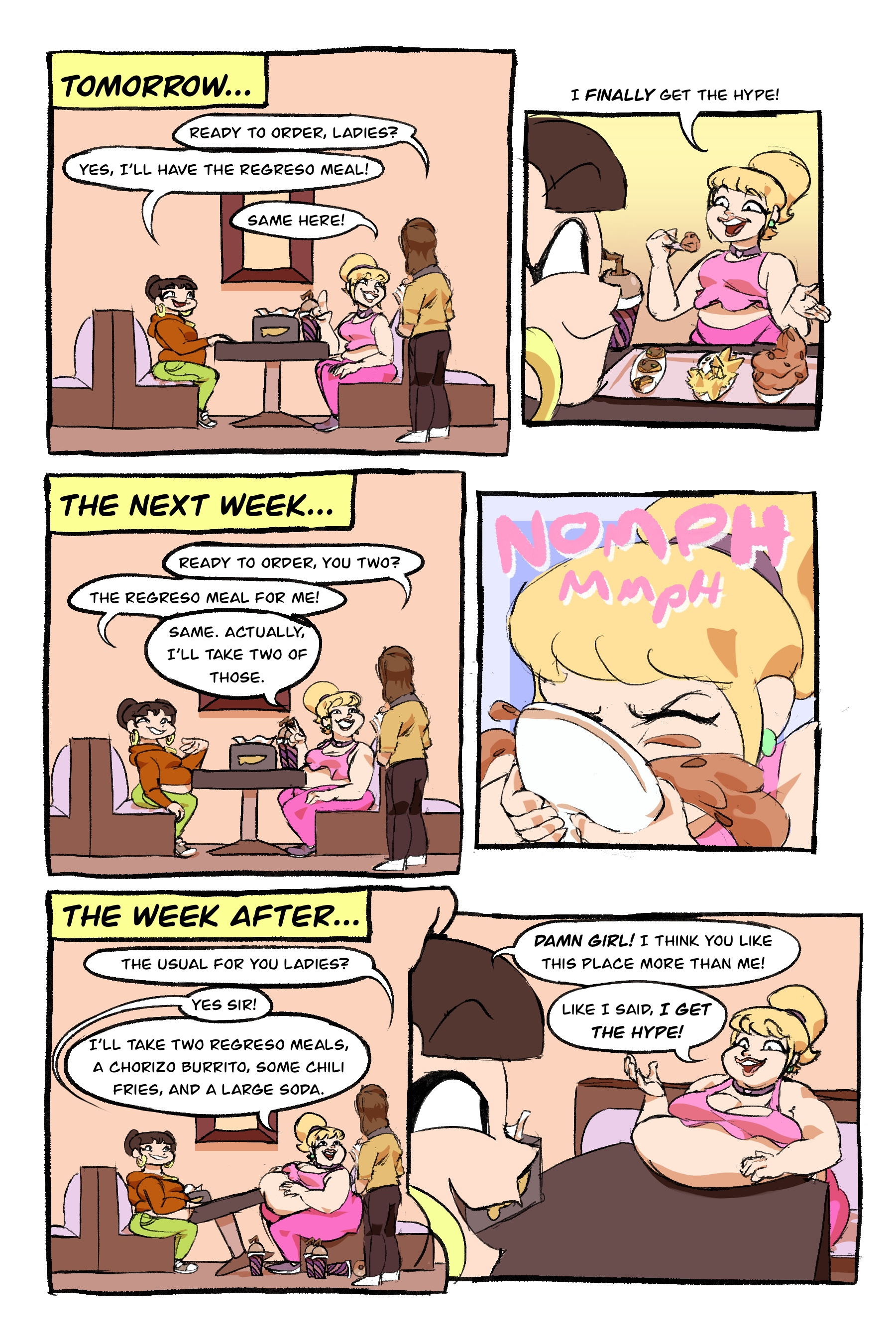 We get 4 panels of the red head customer in the first 23 pages, who is used as an example of a customer who is "losing control", and we get a handful of belly shots of Cassie eating, at this point it seems like the ground work is there for the stuffing and gaining to happen right?