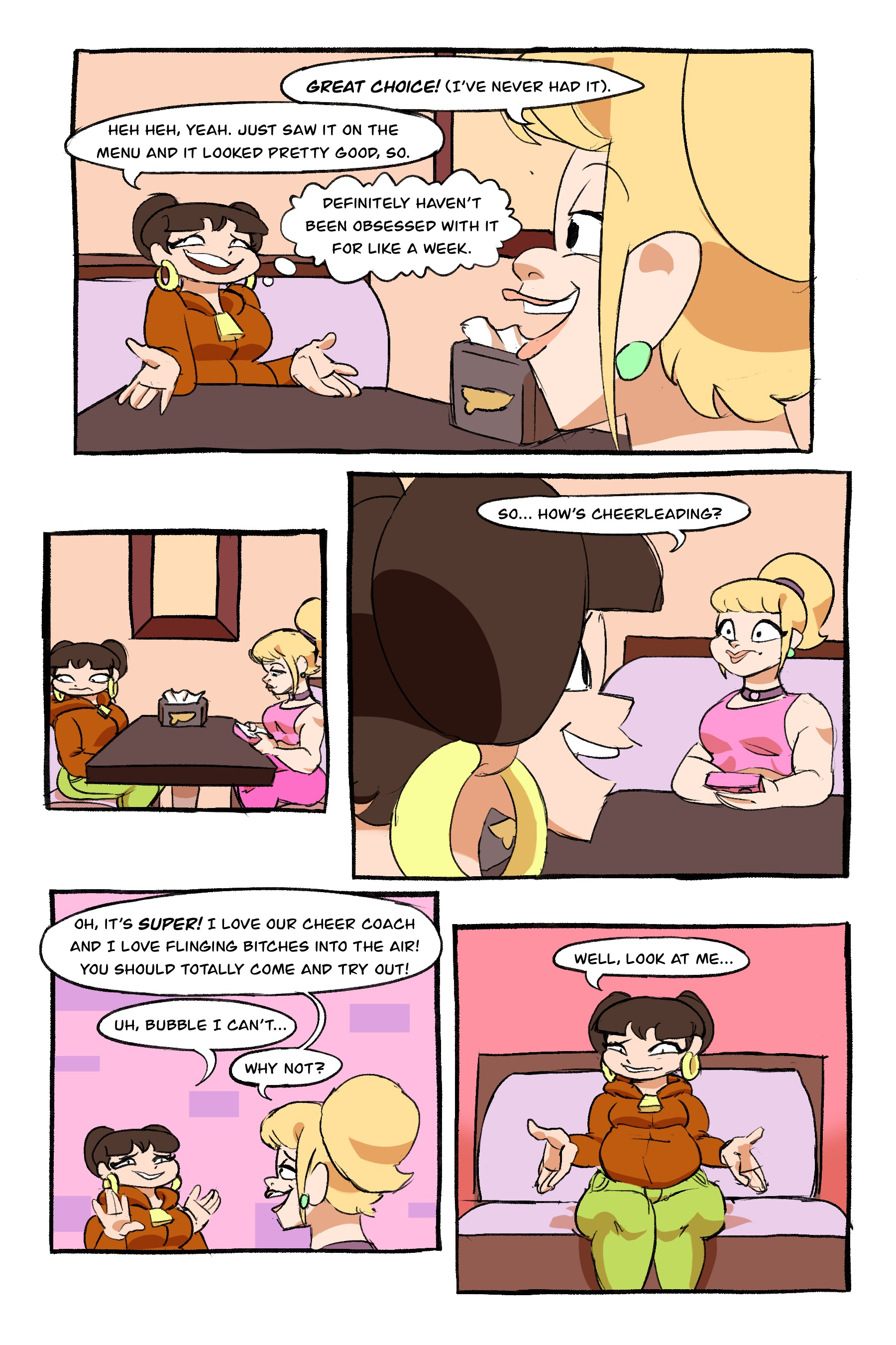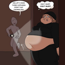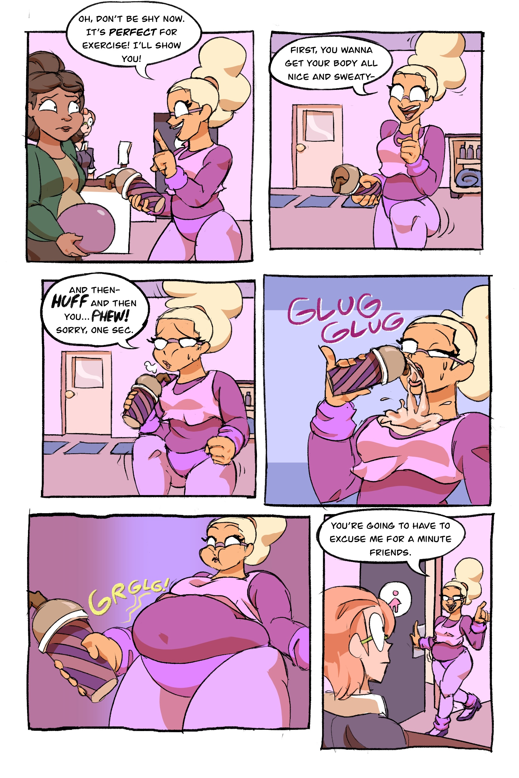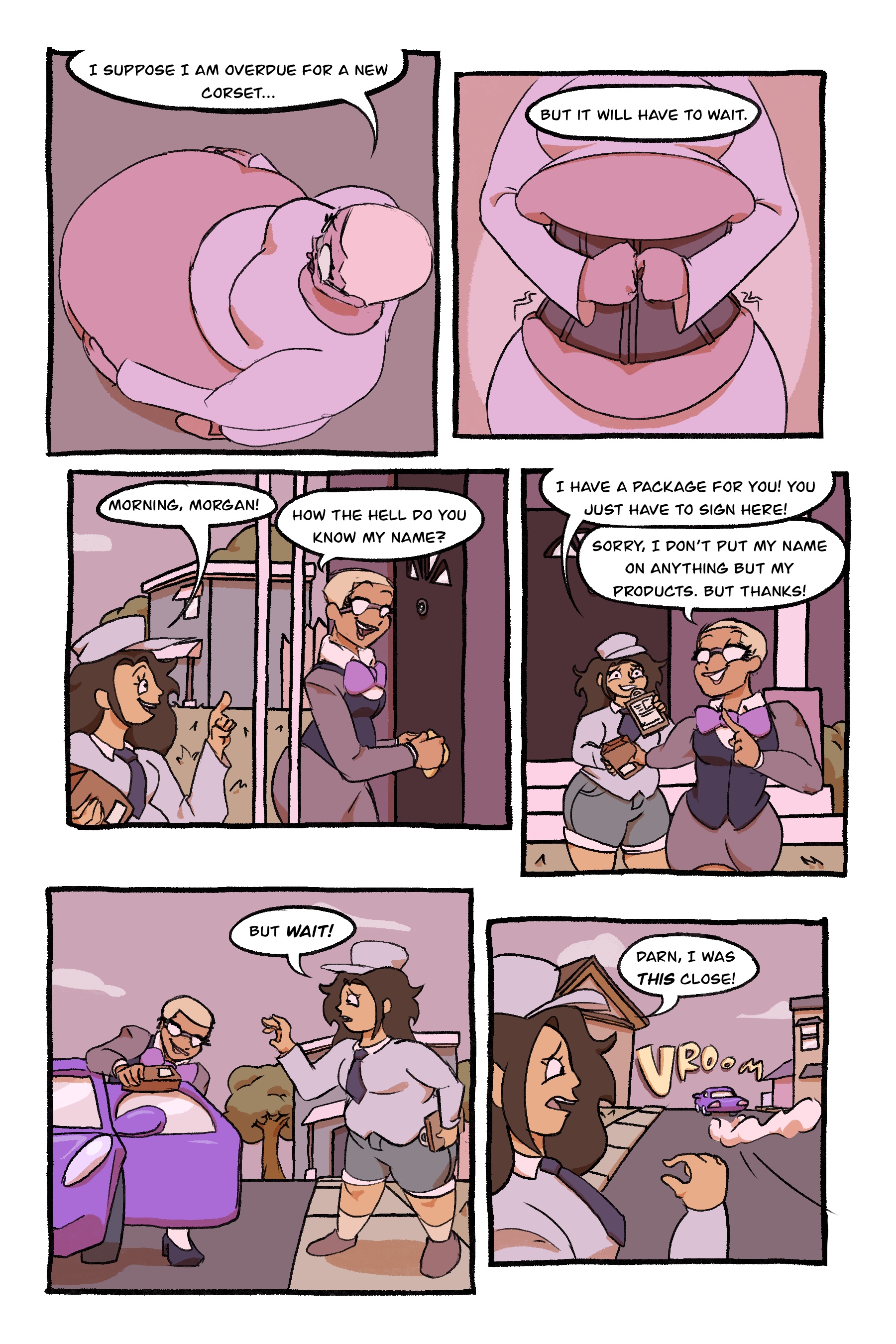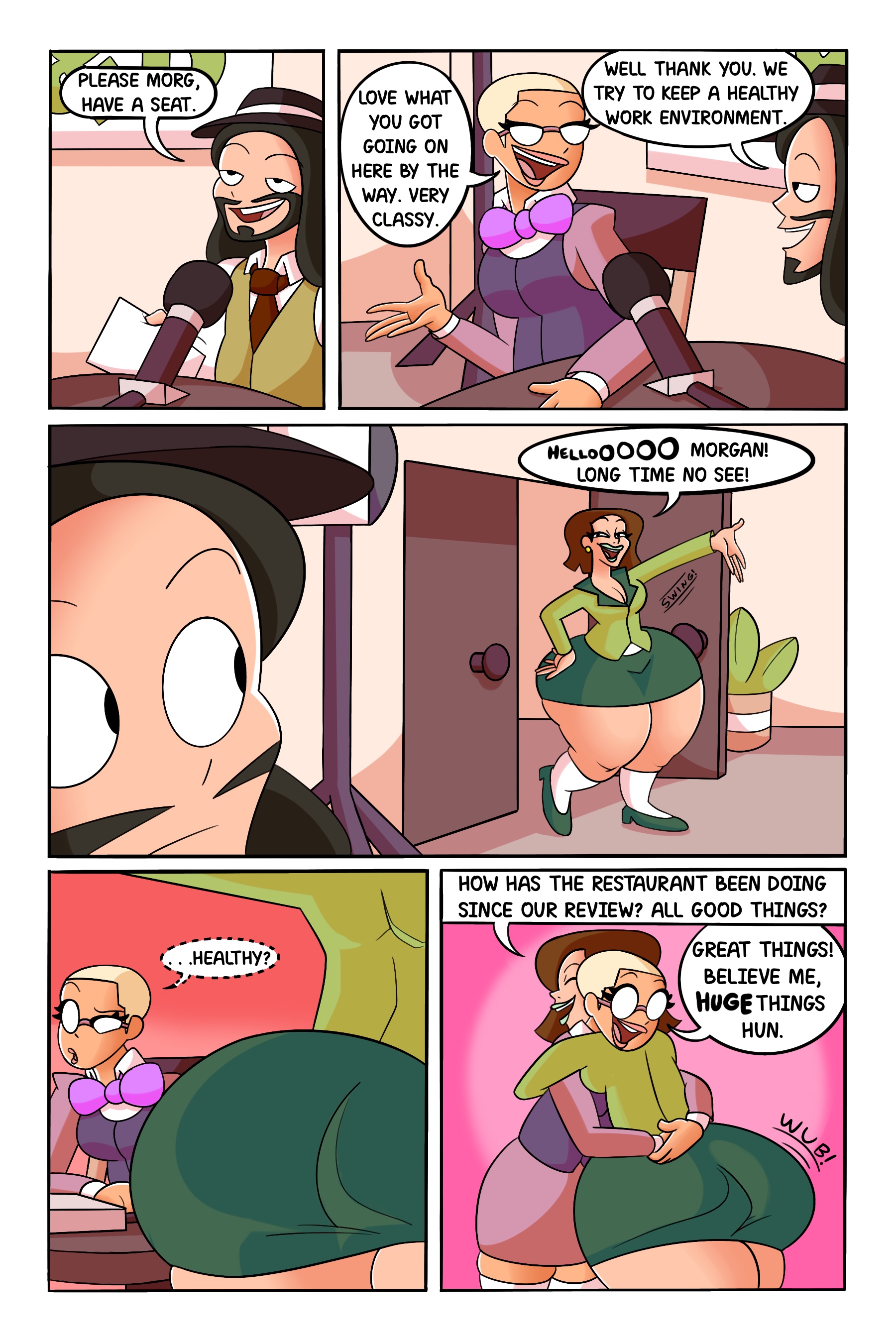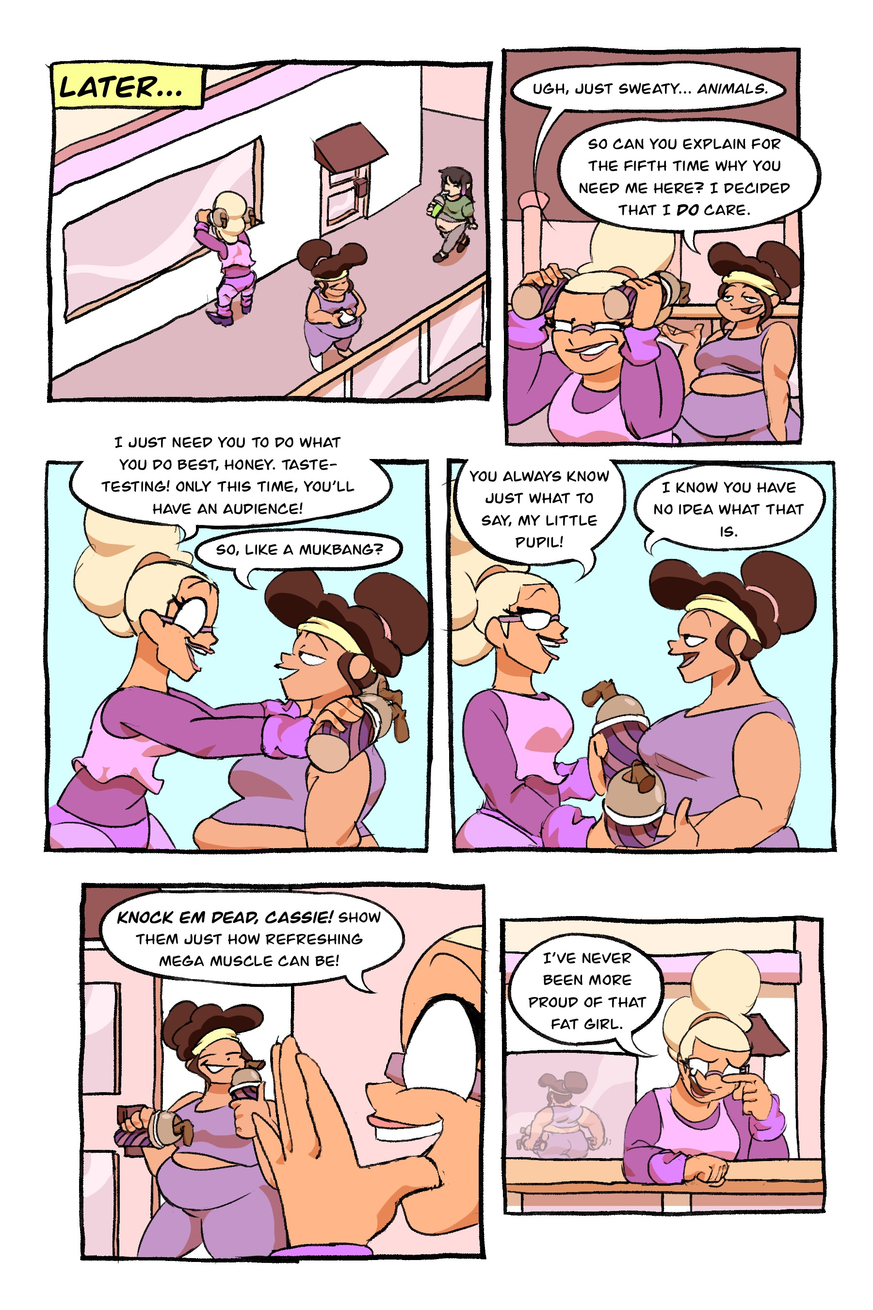 We get 4 panels of the red head customer in the first 23 pages, who is used as an example of a customer who is "losing control", and we get a handful of belly shots of Cassie eating, at this point it seems like the ground work is there for the stuffing and gaining to happen right?