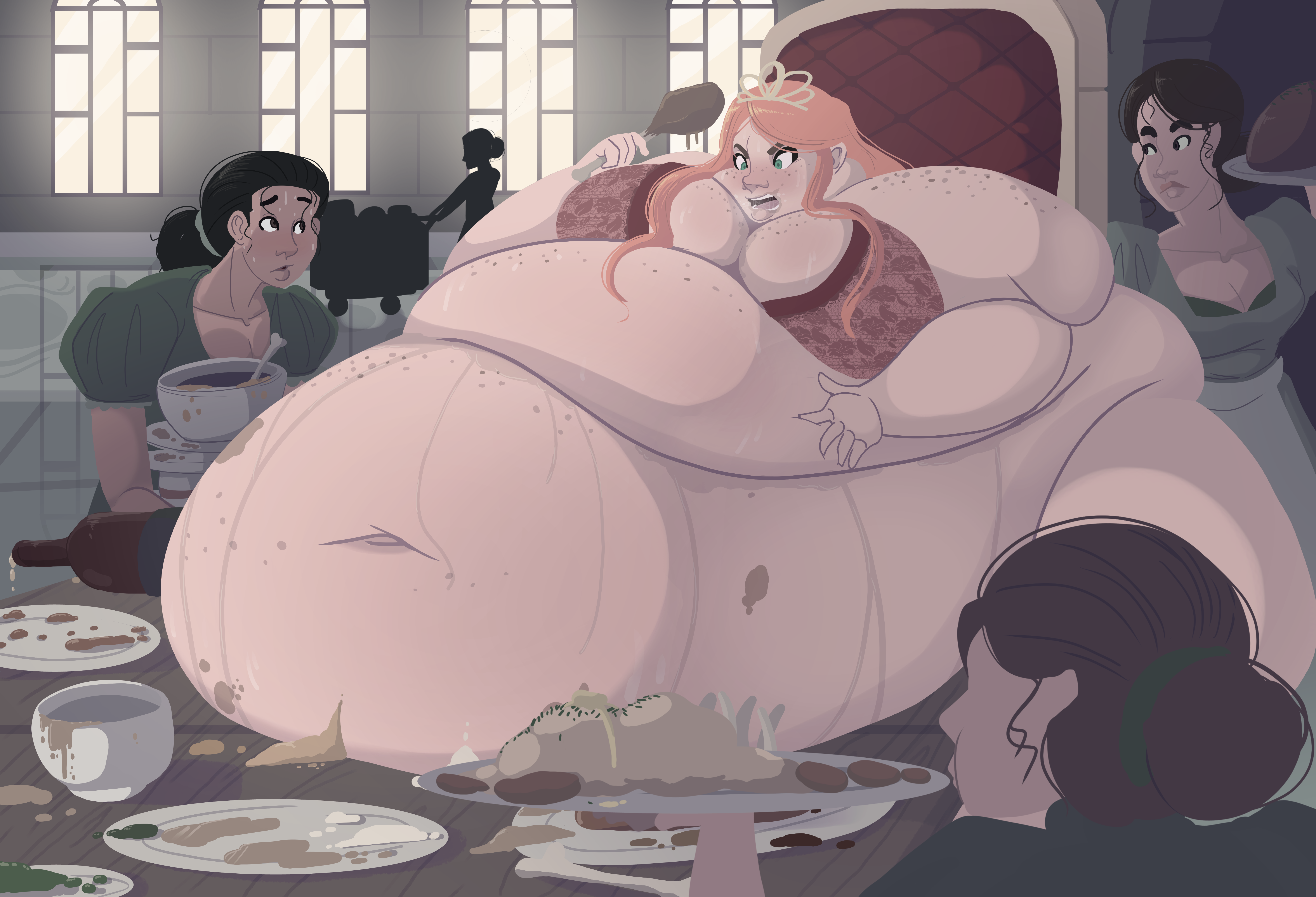 post powerful women (usually rich, goddesses, or monarchs) using their power and influence to eat and gain weight