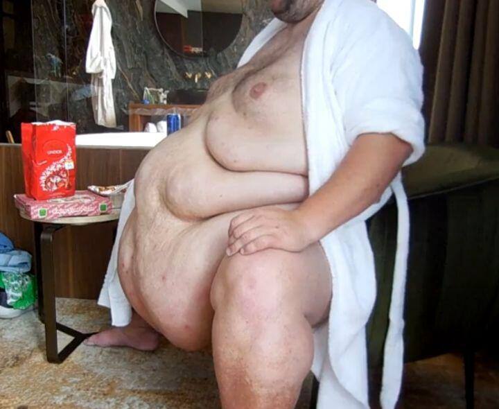 didnt have full on sex with him. belly is insanely massive, goes way past his knees, and he does eat like crazy