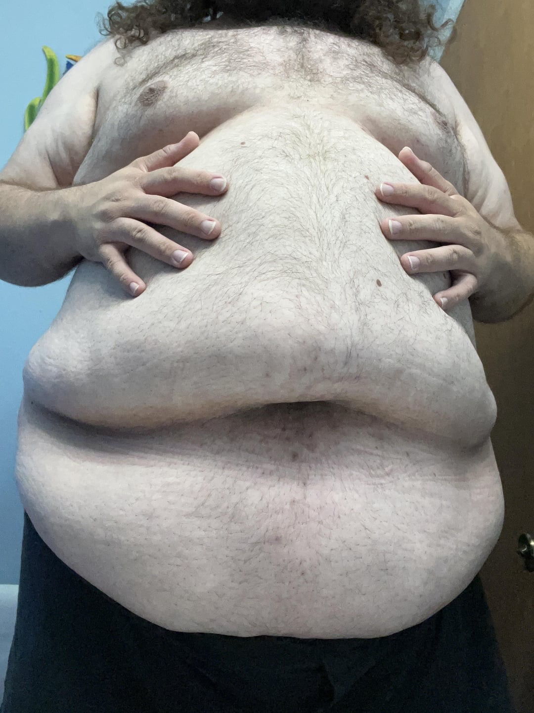 Gainer looking to get to 500lbs. Always been fat but the past few years Ive just been giving in to my want to grow. Starting weight was 290lbs currently at 370lbs. I feel like you guys would appreciate a double apron belly. @feelgoodinc0574 on discord.
