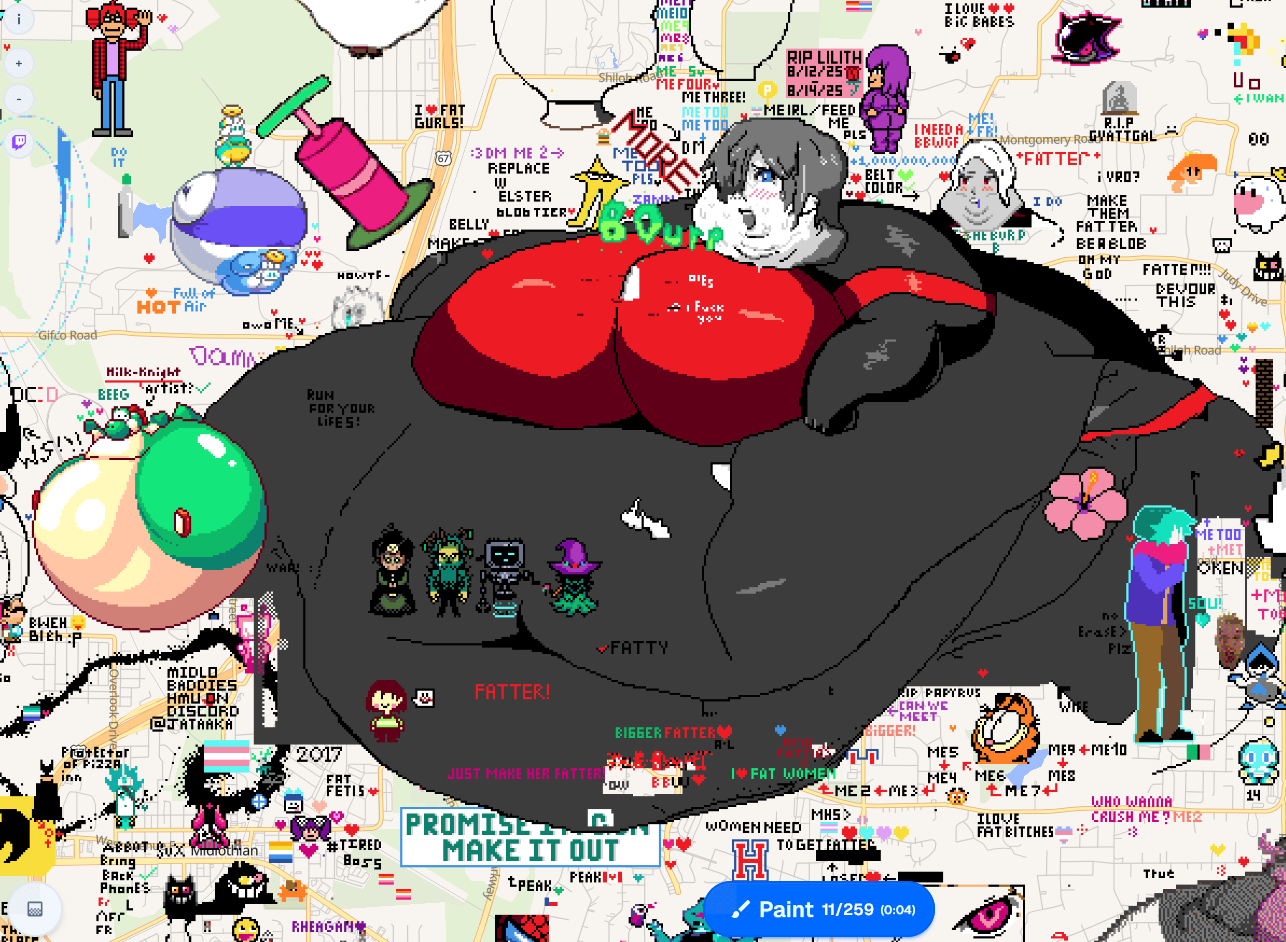 >>12771 Am I the only anon on this board who thinks this is wrong? Drawing fetish porn on wplace is like taking out your dick and waving it around in a public space packed with people. Artist like Roary have the sense to not draw NSFW on there, but there's a bunch of others who seem to think its okay to take up a whole space with something they could have easily drawn in a private ourworldofpixels instance? I don't get it. We have spaces for this stuff, like bbw-chan. Fetish art, even the most tame of stuff that can be passed off "SFW", doesn't belong on there. Wplace is not a fetish/kink space. Whatever happened to time and place?