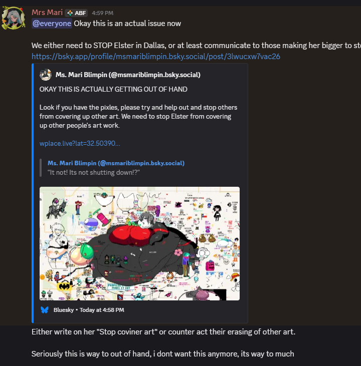 Been checking out Wplace for a bit and thought it could be interesting to have a thread about art on the site weather its something you found when searching or something you’re trying to make yourself (good luck lol) Not try to encourage anything with this thread, mostly just a place to archive anything on the site you find before mods nuke it, even if it’s unlikely due to shit moderation
