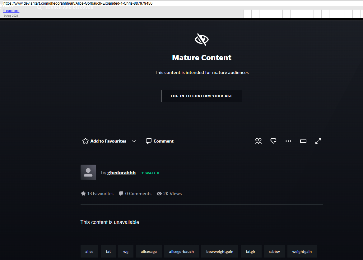 ghedorahhh had a story based on Mollycoddle's Alice character years ago titled 'Alice Grobauch Expanded 1: Chris'. It even has a link on the wayback machine, but annoyingly the archive was tagged with 'mature', so the archival doesn't work https://web.archive.org/web/20210809205933/https://www.deviantart.com/ghedorahhh/art/Alice-Gorbauch-Expanded-1-Chris-887979456 Doea anyone have a copy or know where it might be. I've reached out to Ghedorrah and he doesn't have a copy