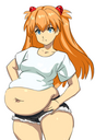 Below Shinji's breasts is his belly, which is very large. It's huge, gigantic; it's the size of a large table and a full-grown adult male could sit comfortably inside the dimensions of Shinji's belly. It's a huge gut, that sags to his ankles, at least, when he's standing, which is one of the reasons he doesn't stand very often.