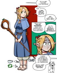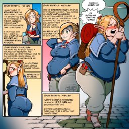 Cisena saw Rella, with breasts large enough they'd interfere with her archery, take a messy bite of honey scone, a drop of honey falling onto one nipple. The blonde slyly lifted up her breast, just able to suck the drop off the nipple, and giggled in pleasure. Brown haired Jelna, once so mousy, put a cookie in her mouth and rose on tip toe, wide hips and sagging ass rising out of the water, to kiss black haired Lala. Lala leaned in to kiss her lover/bite the cookie, building pot belly flattening against Jelna's somewhat firmer waist. Each of the three needed a desperate diet, training drill and chewing out but Cisena couldn't do much but drool looking at the three.