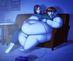 Imagine a future society that figured out how to make fat, healthy. Like you can get fat, and there are no negative side effects from being obese. It's been years since the scientist have discovered a way for us to be fat without the negative health effects. Society changed that day. First me and my bf agreed simultaneously that I should be the one to get fat. It's been my dream, and he's always wanted a "massive gf". Meanwhile, my sis, who came out as being a lesbian, was going to be taking the same method I was. So was her gf. There are a few men who want this method as well, but it is based on choice, on whether you want to get fat, or not. Some take it to help improve their health benefit, due to some being so overweight, that they can't exercise or because of other health problems. Things have been well since then. I'm now 630 lbs, and I'm one of the few that actually walks. Most others use the hoverchairs, or the mobility pads (think motor scooters, but as one big platform). Some use belly wheels for those where their weight is too much. For me though, I have special clothes that pull my flab together while allowing it to strech in case we grow more. My sister and her gf have been the happy blob couple down by the new food shop, where they serve all types of food. Those that have reached ton or above status are usually referred to as blobs or blob people. Most have various methods like robot extenders or "mind-clones" where replicas of the person in their thin form will go and do things that they think, like an extension of them. Anyways, I've finished my mile-long jog and boy am I tired. If you saw me, you'd see this blob girl sweaty, red-faced, out of breath, and jiggling. Hadn't jogged like that since the "3k Jiggle Jog". A lot of people came to that one. I waddle back home to see my now husband making me a feast for a queen. He's been happy with the new changes, and shows his affection every time, even if I've been jogging. "Morning hun, enjoy your jog?" he says, I nod, my jowls jiggling, as I immediately catch my breath. My stomach growls, and he comes up behind me, quickly setting the last plate on the table. "Sounds like someone is ready to eat." he says, grabbing my love handles and jiggling me. I try to push him off, but we're just playing, "C'mon, let me eat before you do that." I said. After we load up our plates, with me getting the majority of it, we go down to the living room where we watch the news. There on our local news is Jessica Smith, the 850 lb Bombshell, still reporting the news, and one of the first anchorwomen to take the weight treatment. Her tan body and short hair work for her, along with the makeup, as she starts the story with the talk of the anniversary of the weight treatment. These are the best years since we've discovered it.