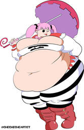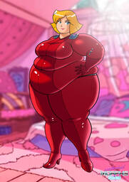 The clowness groaned in pleasure and relief, her paunch free. It was large and soft, rolls had began to develop between her belly button. Her armpits began to feel pinched, and she looked down at her arms. Bingowings were forming, she was always a bit chubby, but now she was downright fat. The widening lovehandles bulged against the side of the chair. Still though, she had to keep swallowing. Soon the barrel would be empty.
