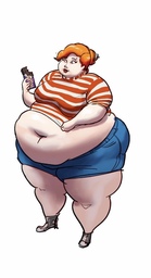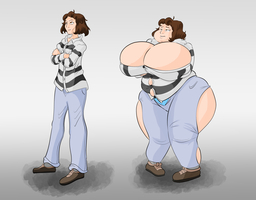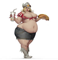 What were they saying? He was going to need building insurance? Lily's mind snapped back into reality. "W-wait, buil-*bwehp*-building insurance? I must have had dozens!!" She shifted her momentum side to side, glancing at her haunches. Her bottom cheeks were pushing into her back folds, and her belly was forcing her legs apart. She felt full, uncomfortably full. Worryingly, the group got further down in her vision, as she swelled up. The folds on the side of her torso grew new folds, she was swimming in dough. Her stomach pushed out further, The suit's tearing finally coming. A deep naval exposed itself, that was deepening further.