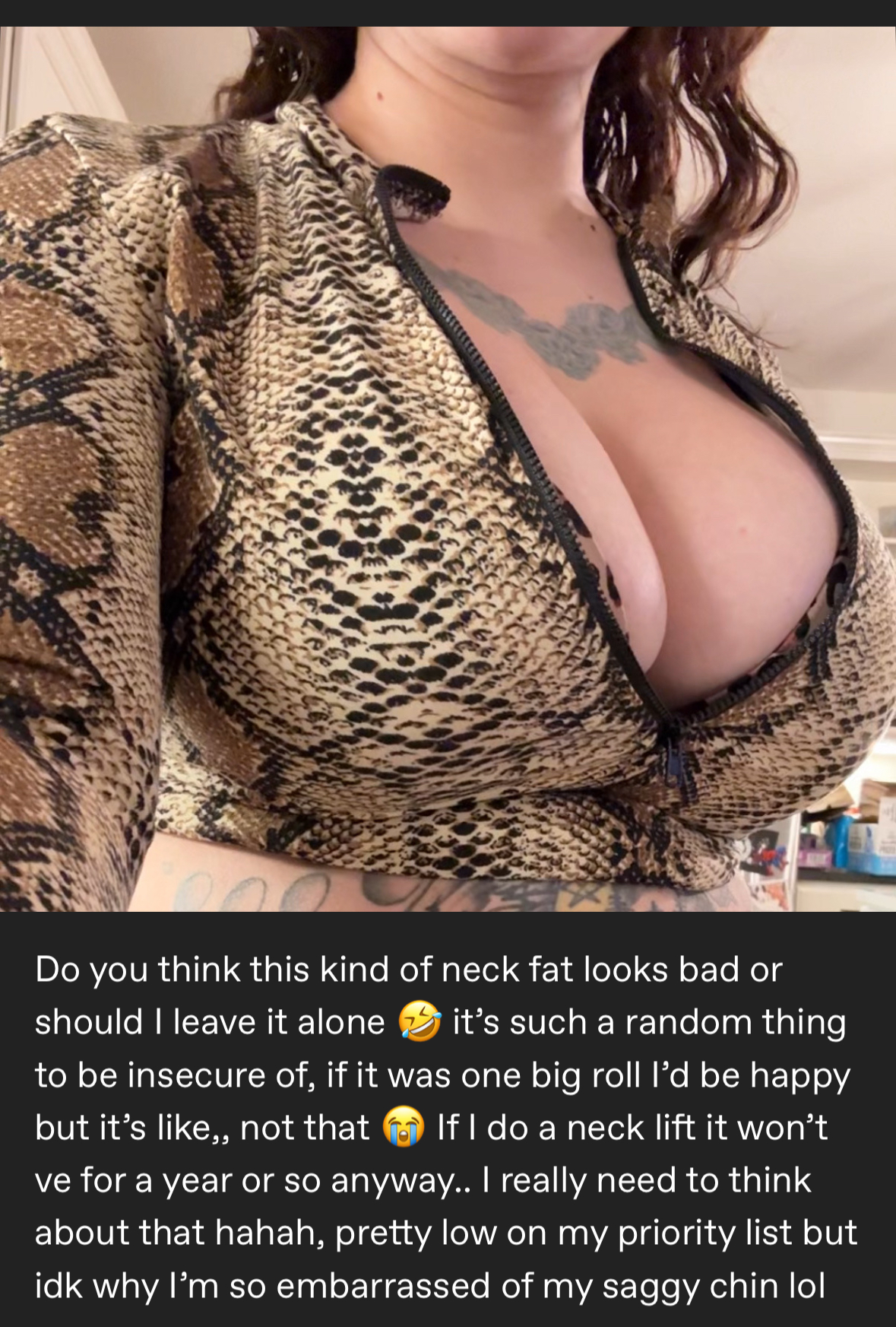 >>70921 You’re delusional. She got lipo on her chin. The only reason she has loose skin on her chin and on her belly is because that’s where they took the fat from. The skin is loose because the fat disappeared QUICKLY. The rest of her body is tight and toned because she worked out and lost the weight. She was self conscious of the double chin, and told people that her fans liked fat girls without fat faces. She got liposuction on her double chin, that’s why it was there one week and gone the next. Her belly was sucked out for her BBL’s. That’s how BBL’s work, they had to take the fat from somewhere and that’s where the most of her fat was. She is clearly insecure about the loose skin on her chin based on her own posts and she’s insecure about the loose skin on her belly because she’s posted about that and keeps hiding her belly. She is the reason for her own insecurity by getting her fat surgically removed and causing all the loose skin. She’s self conscious of the two loose places she had fat surgically removed from her body and now wants more surgery to fix it. She’s addicted to plastic surgery and you’re a delusional coomer