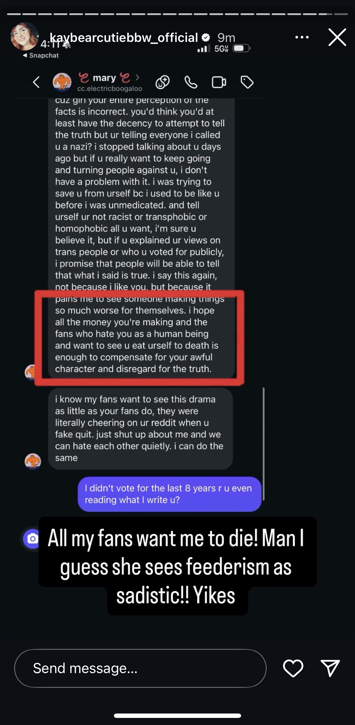 >>70923 kayla is one of the worst feedees out there who none of the other models in the scene like and just likes to start random drama about other feedees while she got caught faking her weigh ins and supports maga. Her attacking chubby chiquita is one of the worst choices she can make and will just make kayla one of the most hated feedees on the scene. Mary is super loved by the community while kayla is always being bullied and can't take criticism online while acting stupid