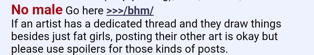 >>73935 I want for the old exception to be eliminated, making all posts that has male fetishes, furries, trans, and all >>>/bbwalt/ related content prohibited from being posted on >>>/bbwdraw/, even if it the posts are relevant to the artist the thread is about.