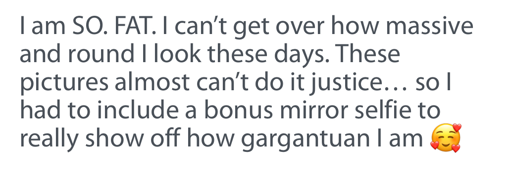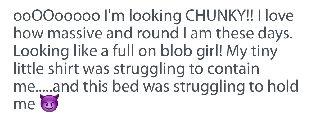 She often talks about how ridiculously small normal sized stuff is, a tub, a van, a bed, and chair. I want to hear her talk about how massive she is, how she is too fat for everything, not falsely imply that a tub that can accommodate 99 percent of humans to ever exist is small.
