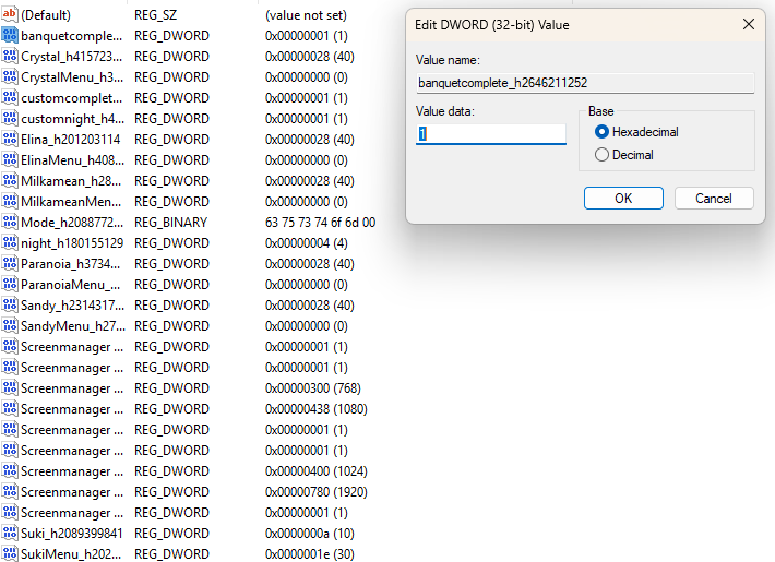 I'm extracting the inflation content from Five Nights With Fatties 2. There's not a lot. Here's a full save, rename it to Player.data and move it to C:\Users\(your username)\AppData\LocalLow\Poppu\Five Nights With Fatties_ A Second Course :https://files.catbox.moe/f5zyy2.data Can someone who unlocked the gallery mode in FNWF 1 upload a screenshot of their save in the registry? It's located in HKEY_CURRENT_USER\Software\Sunadoke & Team Poppu\Five Nights With Fatties. I need to know which values unlocks the extras. Link to the games: https://team-poppu.itch.io/