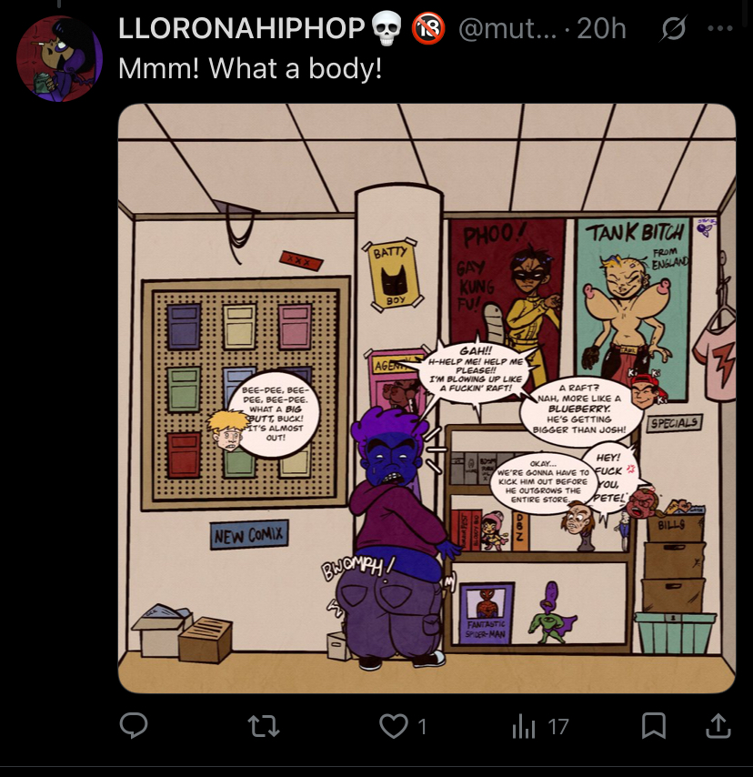 Not something I'm pissed about, but this page is really fucking funny: https://www.deviantart.com/blueberry-yor-forger/gallery This guy's got a whole page of Yor from JuJutsu x Academia Kaisen Family AI sloppa pasted onto pieces of pre-existing blueberry art, screenshots of 05 Violet, and the Faridae Juicing Room comic. Amazing stuff.