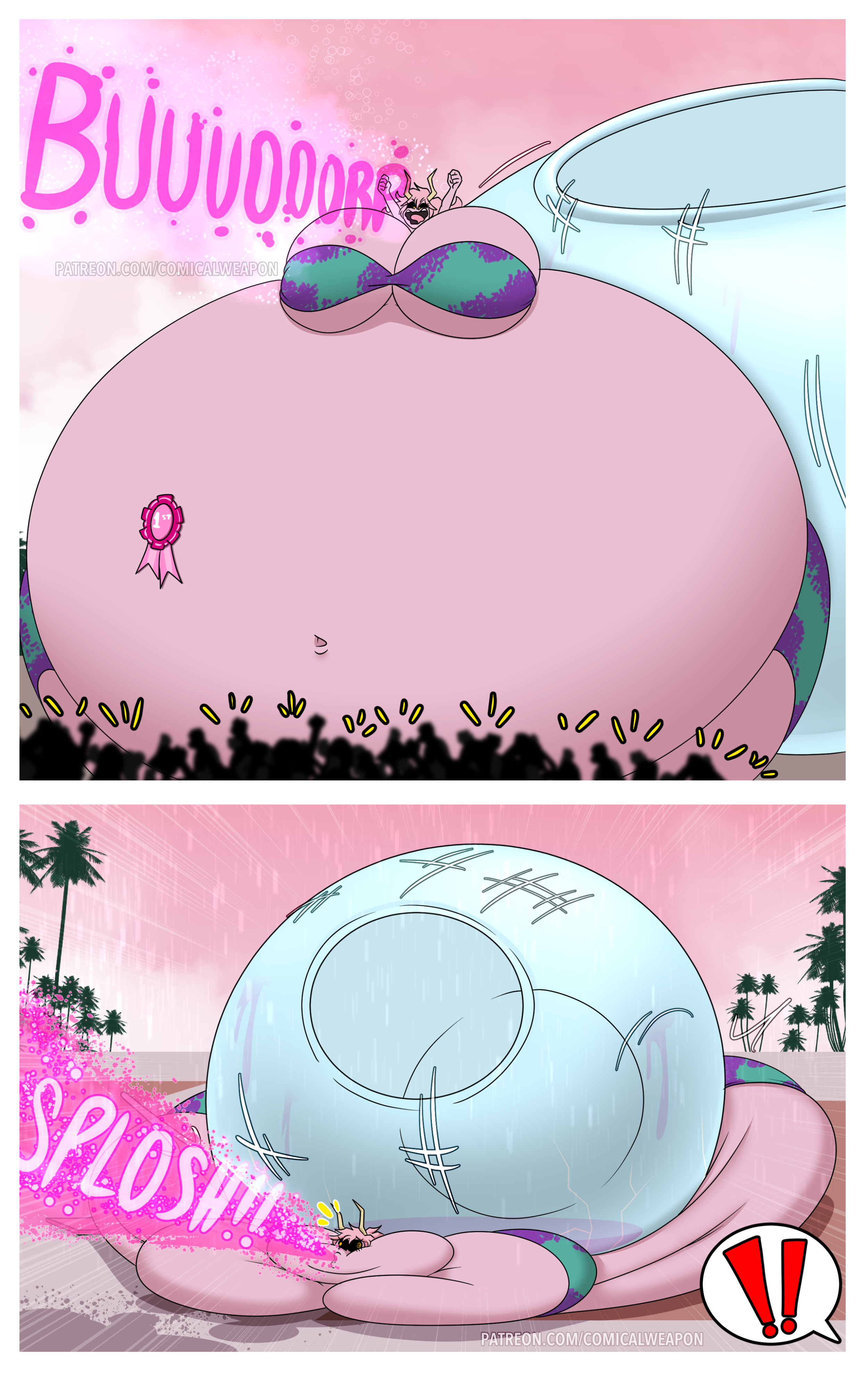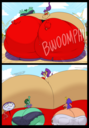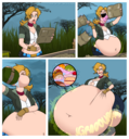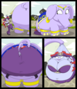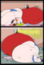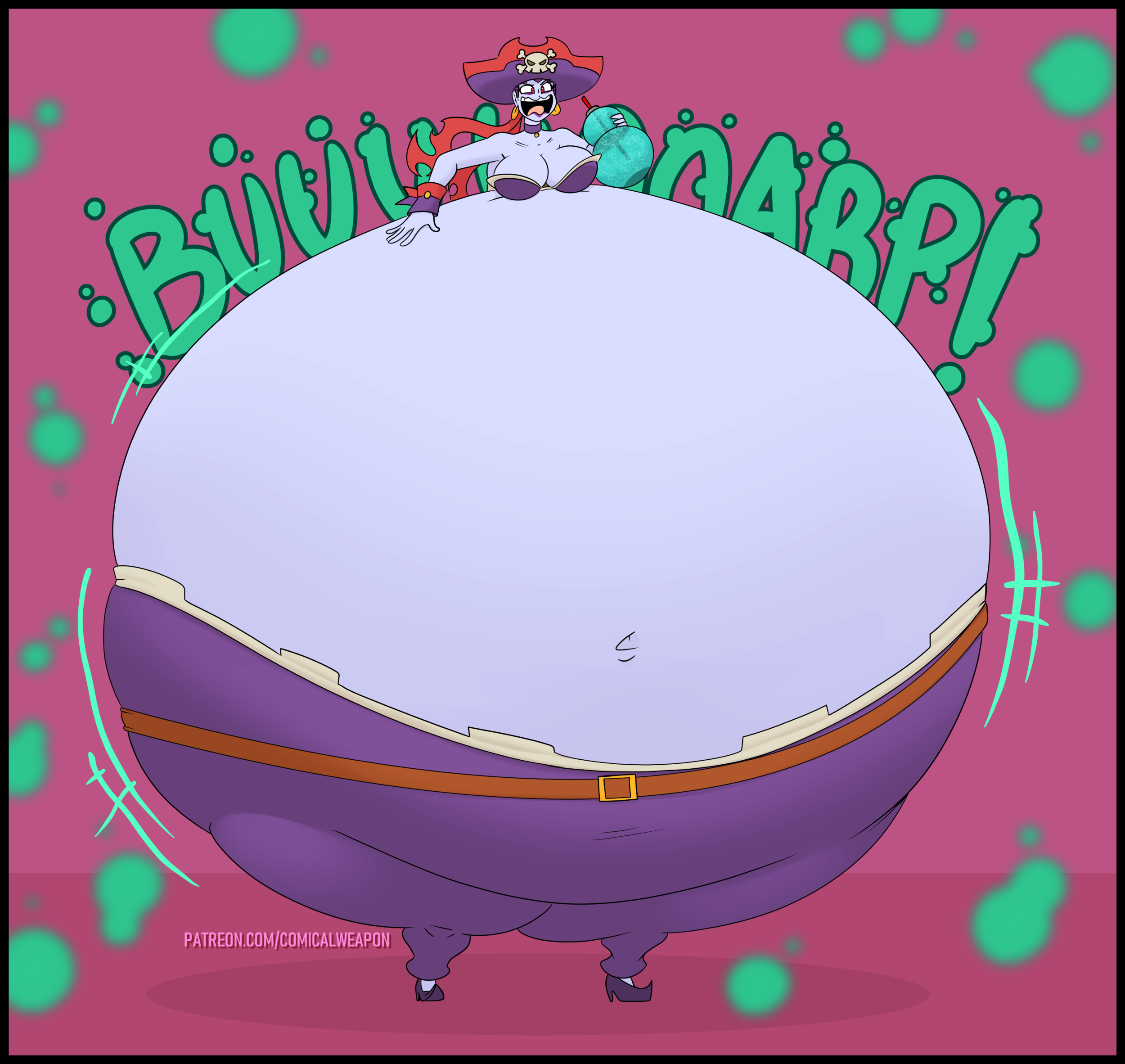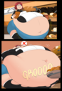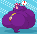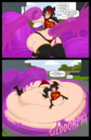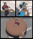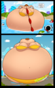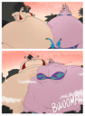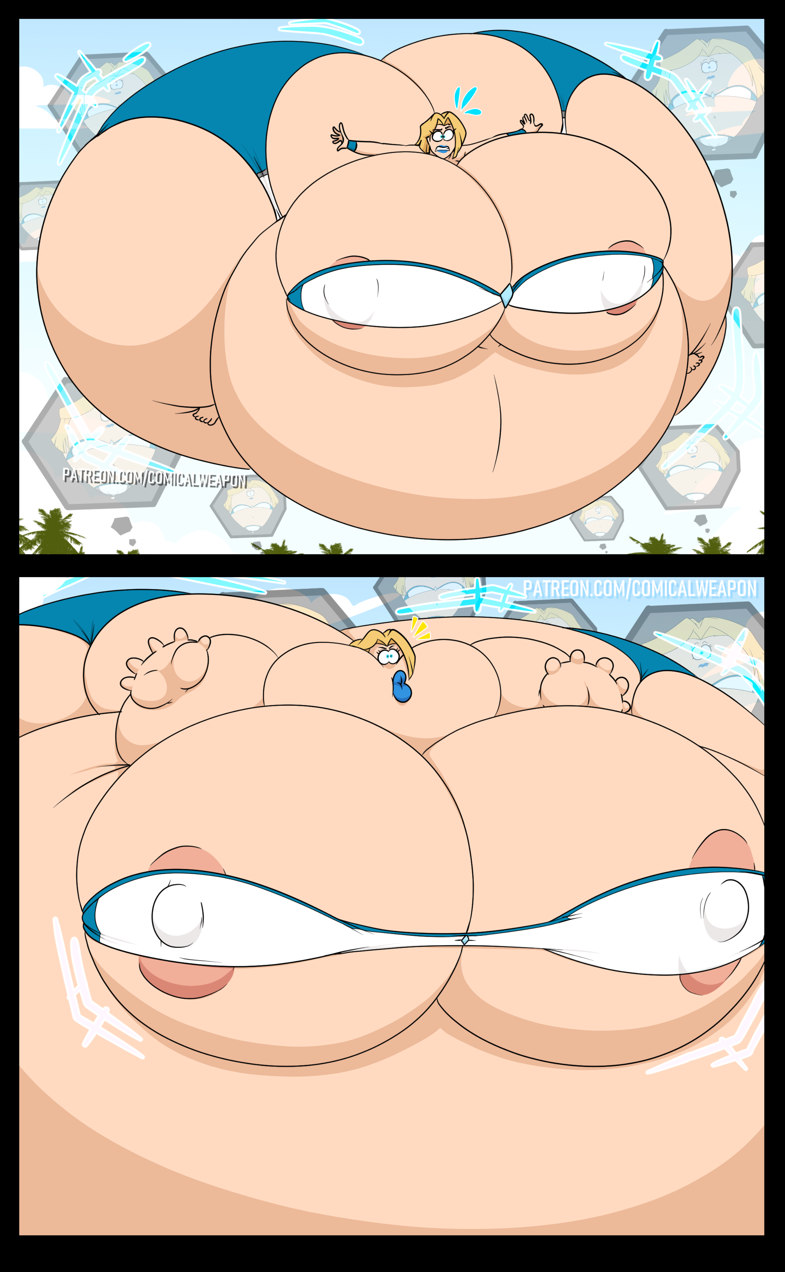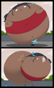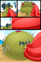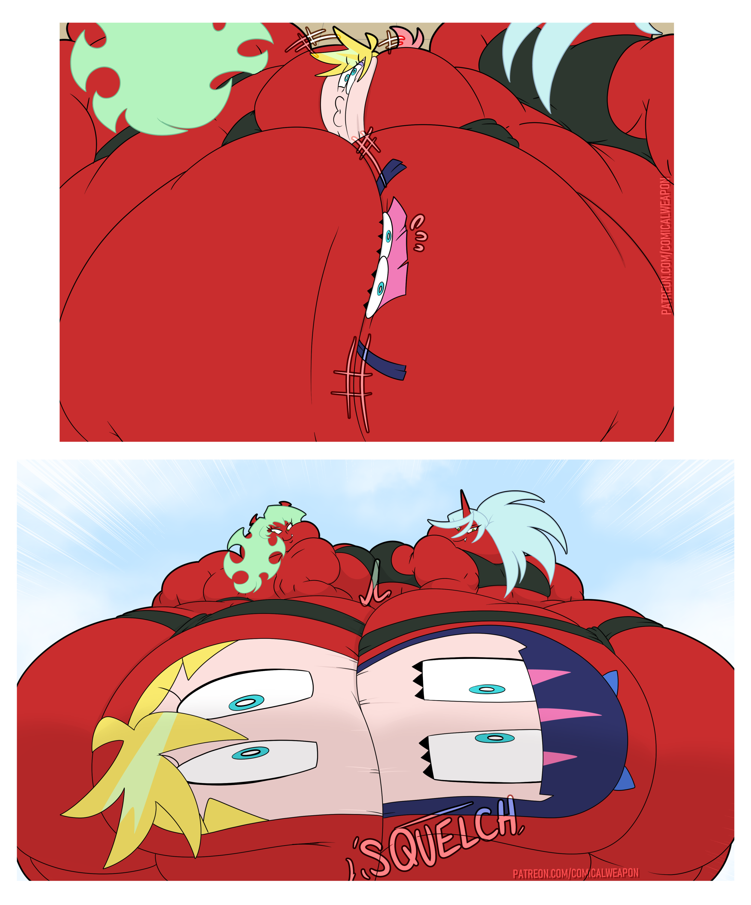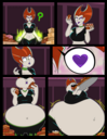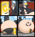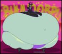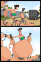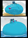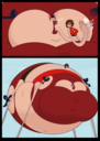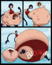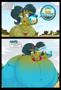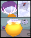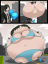 Revy attends a parade, but she's super bored. while she's standing there sulking, she spots the evil hands up to something. she follows them into a warehouse where they slam the door shut and zap her with a ray that causes her to inflate into a smiling parade blimp. Then the hands tie ropes to her inflated hands and feet and float her out the top of the warehouse, where she becomes part of the parade herself. The crowd cheers as her blimped body is paraded in front of everyone, and her expression in the thought bubble shows she's not only embarrassed, but more than a little annoyed at her predicament.