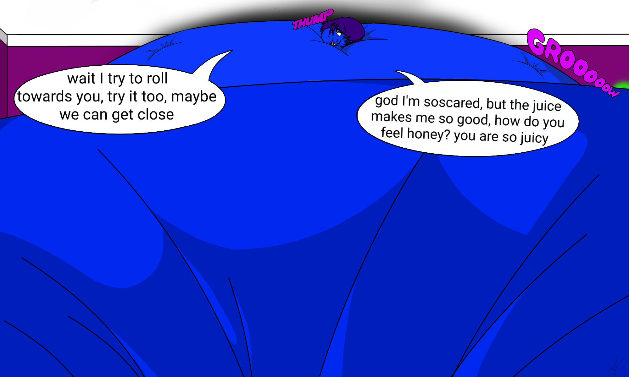 Male inf story of my own creation. >You stared at that tank, and the other end of the hose you had connected to it. >"Is this really a good idea?" You asked to yourself. You lived alone so its not like anyone would walk in on you. >After one final moment of deliberation you took the hose and pushed it into a pair of cheap underwear until you felt it go between your cheeks and into your asshole. >You couldnt help but let out a moan as a tent began to rise in your underwear, and it felt so good you just HAD to push it a little deeper. >With a groooan you pushed it far enough to feel it was secure, and with one hand fondling the fabric that held your dick, which was rock hard and throbbing against the fabric, your other hand shot out, grabbing the valve and jerking it wide open. >You were barely able to hold back when the hose started jiggling, but once the cool gas started blasting in, there was a wet spot on yout underwear. >You couldnt see them though. Your eyes were drawn to your gut as it ballooned outwards fast! Already you looked heavily pregnant and it wasn't looking like it would slow down. >Your hands were shaking, unintentionally opening the tank as far as it would go, accelating the growth further! >Your mind was starting to cloud with bliss, so it was hard to notice your gut suprassing any size a woman's pregnancy could reach, looking more like a rapidly expanding beachball. >3 feet, 4 feet, 5 feet. The gas seemed almost eager to fill you up, but you could feel something more, a tightness in your hips, finally moving your hand off your dick for a moment you could feel them inflating too! >You tried to fool around with your underwear, to pull them off, but your hips had already grown so wide the eleastic couldnt stretch over them. So you went back to trying to fondle yourself, but now you had to work to reach them as your hips grew and started to squeeze your dick out of your reach. >You had to swap to groping your own sensitive gut, and that immediately rewarded you with pins of pleasure across your stretched gut. It was so wide you couldn't even touch both hands in front of it. >A soft sh-rii-riiiiiip filled the air only for a moment, and a billowing FWOOSHMP could be heard, but you could feel a tightness on your hips. Were you full? You didnt wanna be yet you still had a lot of tank to take! Or you hoped you did. >If any onlookers could see you, they'd see a massive gut first, easily 10 feet across, with uncovered hips that were slowly starting to peek out aroubd them, underwear in shreds but barely holding on by the elastic. >You could feel the elastic waistband down there, and even used a hand to test its stretch, it had very little to give, pressing that hand into your hip and the other one into your gut, they still squished, you could take faaar more. >Before long a TWANG, followed by a soft smack could be heard as the remains of your underwear were launched off. >Carefully you tried to walk towards the glass doors to loom at your reflection, and had no luck, you had to end up waddling over to them to see your ridiculously huge pear shape. >Neither your gut nor hips would fit out that door anyway. And with your gut taking most of the gas your hips were only partially visible, but turning to the side you got to see. >Your butt had grown to the point where each cheek would take up an entire couch cushion, and you groped at what you could reach to admire your own body. >As you watched your reflection copy you, you saw it, and by extention yourself, start to rise off the floor. You kicked your feet ss they rose for what little that would do to help, but you couldn't control the rise from the helium within you. >Slowly your body rotated as it rose, until it gently and silently bumped against the ceiling, but that touch released a flurry of horny noises from you. >As you looked from your angle you couldnt see or even do much, you were squarely stuck, the gas continuing to pour in and making youe gut grooan in peotest as it further stretched. >You wish you could do more to sate the burning lust within you but you couldnt reach anything, not your dick, not the hose, not the tank, nothing! >But you did have one 'lucky' break, the contant gas flowing into you had finally stopped, the tank must have run empty, leaving you a massive pear shaped balloom of a guy on the ceiling, entirely unable to move and struggling to do more than hump at the air and moan. At least for as long as this lasted~