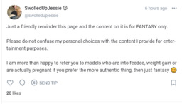 >>966 I understand her doing all of this cosplay but she really needs to give it a rest. it doesn't work with everything. so far all of those fake belly pics have her in those wannabe anime outfits and it just doesn't work. if she tried something normal like a regular top and pants she could probably pull it off. also, I'm beyond annoyed that the pics dropped over a month ago and she's still editing the videos. I am so glad I didn't join her onlyfans then because id have cancelled my membership on principle. I know I'm off topic so getting back to jessie, her belly isn't as big, you can tell its plastic and she isn't even attempting to fake it. i think the problem is that the bellies are not colored anywhere near skin so it's best covered up like voreacious did or in dim lighting like reiina did. jessie does it in full light and then you can tell just how bad it looks. to add to it, I'm also into the belching fetish. jessie used to be my favorite. I didn't know any better. voreacious has her beat by miles. jessie really needs to step it up because these newer people are blowing her out of the water at her own game. she had the fake belly first then reiina then voreacious. she was the first. she's been in the business longer. she know what people want. why is she not delivering? and she aint offering customs either so there goes asking.