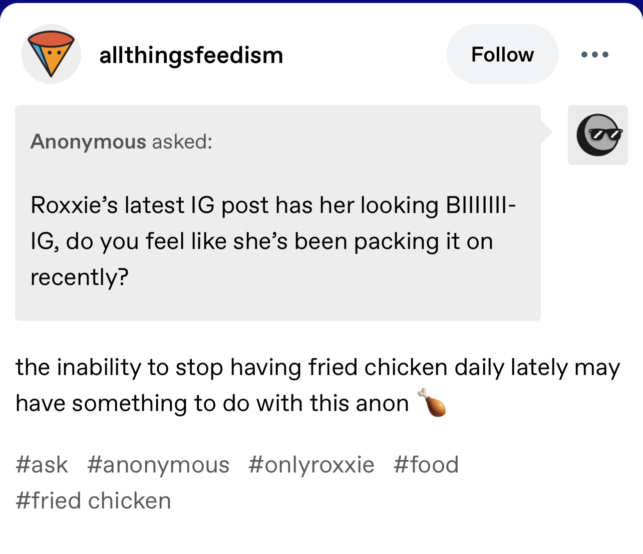 >>165148 So … the theory is that she’s been more careful about gaining because in March 2023, she posted a photo of her from the hospital, from Thanksgiving 2022. Said she would do a video of the details. Her content reduced dramatically from there, and eventually lead to a 6 month break between Feb & August last year. She’s still fat, but lost a considerable amount of weight. Roughly 60-70lbs. Video finally comes out, says that she thought she was having a heart attack after Thanksgiving. Went to the hospital, wasn’t the case. She & her husband have attributed her weight loss to her new ADHD medication, but no reference to the break - aside from her husband confirming that they had suffered a loss (one of their pets passed I’m guessing). She went through a rapid gaining period prior to her break. Finally breaking that 500 barrier and then shortly after gaining 25ish lbs. Since she’s shown she’s able to RAPIDLY pack it on, her slow gain makes people speculate that she’s either not gaining on purpose, just vibing, or curating her gain to be much slower. (Yes, I have autism. No you don’t need to point it out. Fuck off. Thanks)
