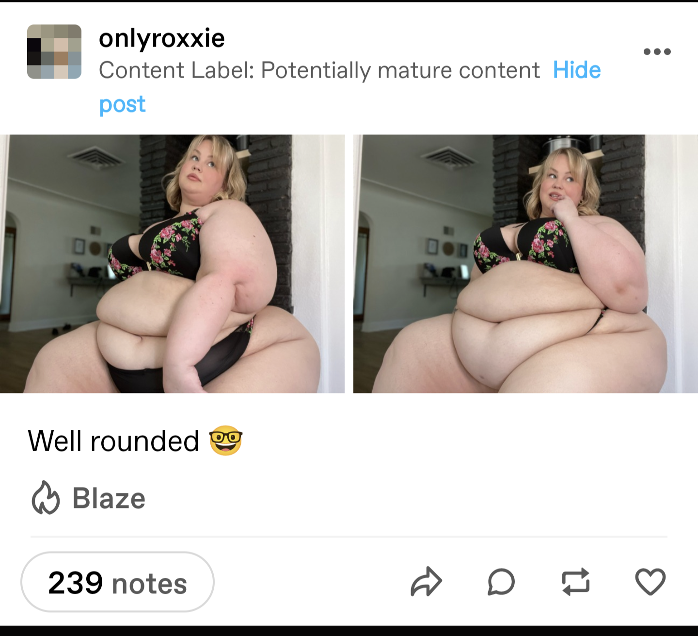 >>140012 A bunch of delusional coomers were insisting her most recent drop of 20+ videos are all recent, and that she's the heaviest she's ever been. When in reality, she's visibly different weights and has different tattoos in all of them, not to mention the one with LisaLou which is clearly from their trip in mid 2023 (it was April or May, I was subbed to Lisa back then but don't remember the exact month). So we have a range of over a year, with different sizes and tattoos, and then some guys were confirming that some of them are in fact reposts from her OF. So she's just uploading all her old stuff, which is fine, its christmas get that money. It was just cringe of these guys to act like newborn puppies with no object permanence, trying to convince themselves she's 550 pounds and that it's normal or sustainable to post 2 videos every single day.