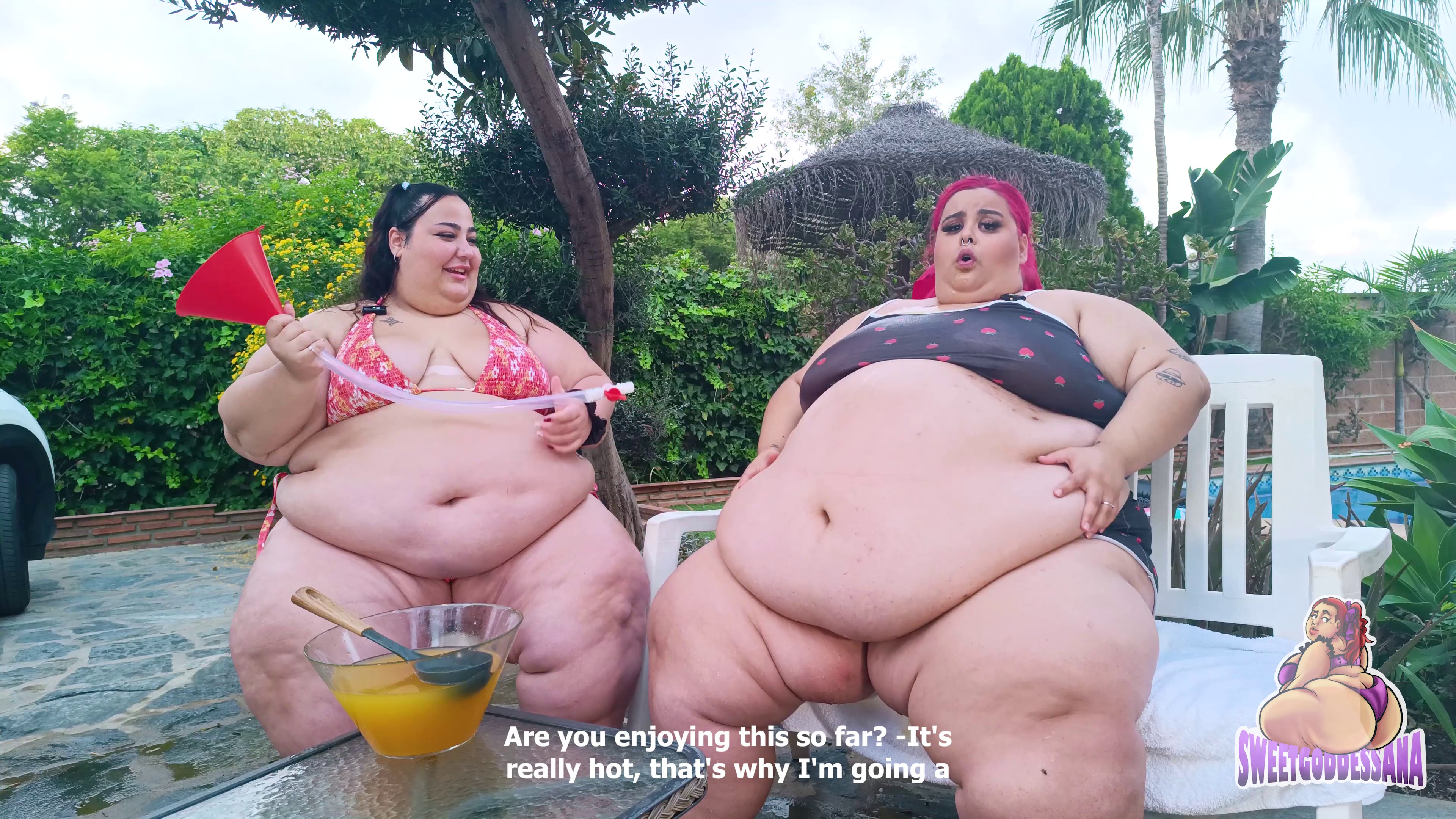 I love how Ana is doing; her belly is getting rounder and more prominent. I hope she drinks a lot more milkshakes or makes more videos of Coca-Cola with Mentos; that definitely helps flatten her belly. Additionally, Fatvenus looks a little heavier; I think spending time with Ana is having a good effect on her.