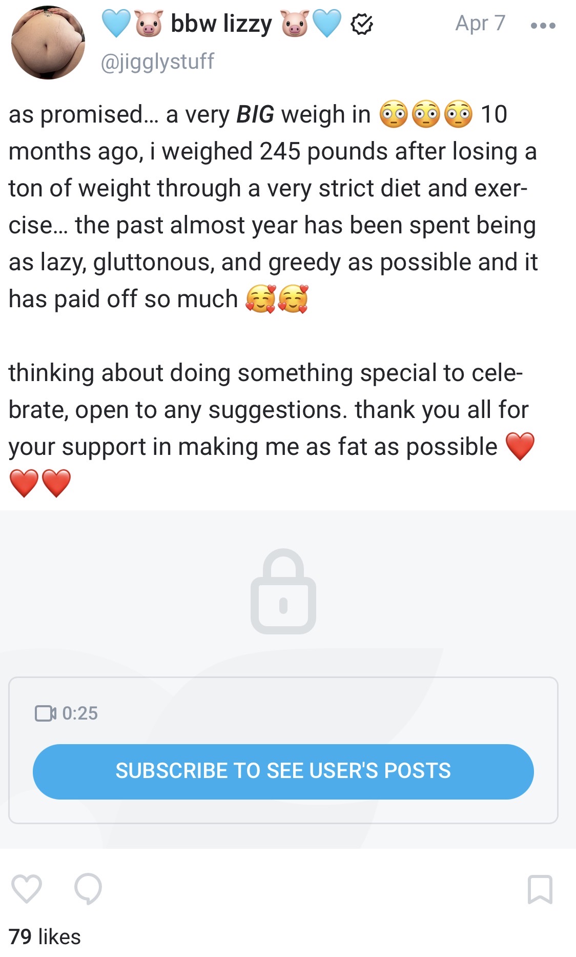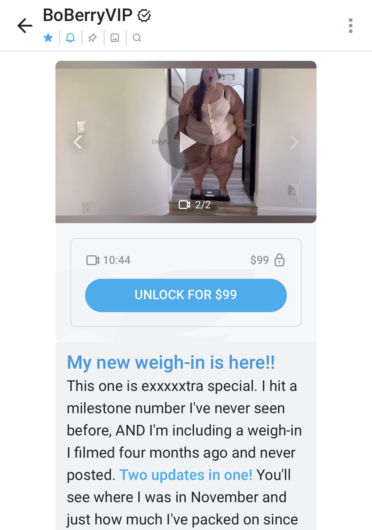 Anyone able to grab the newest BBW Lizzy /Jigglystuff weigh-in and other recent videos of her off her OF? https://onlyfans.com/jigglystuff