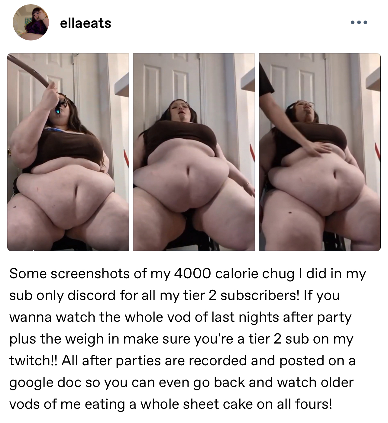 She's streaming on Twitch with the same name at 8 pm est. She's doing feedee stuff while she plays video. So if she dies in a game she'll have a slice of pizza or something. She also shows off her stomach and what not..the streams usually last 2 hrs. All the details are on her Tumblr.