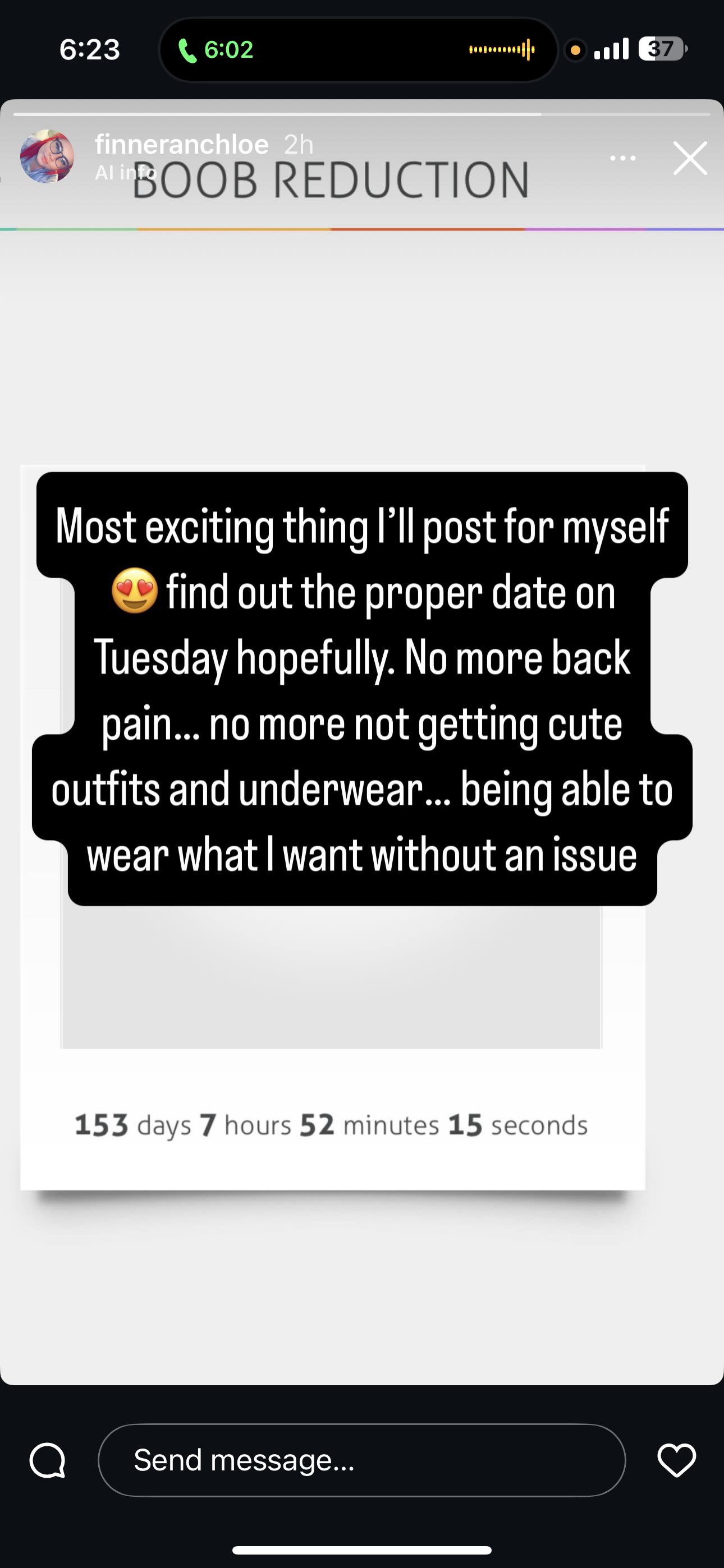 It is me. That’s why the screenshot says my story. Doesn’t say my username how it would if someone else screenshotted. Everyone just sees massive boobs but doesn’t see the issues that come with them. I have tried to get this reduction for 12 years. I was a Double F when I was 13 years old! So im doing this for me no one else. You don’t want to see them.