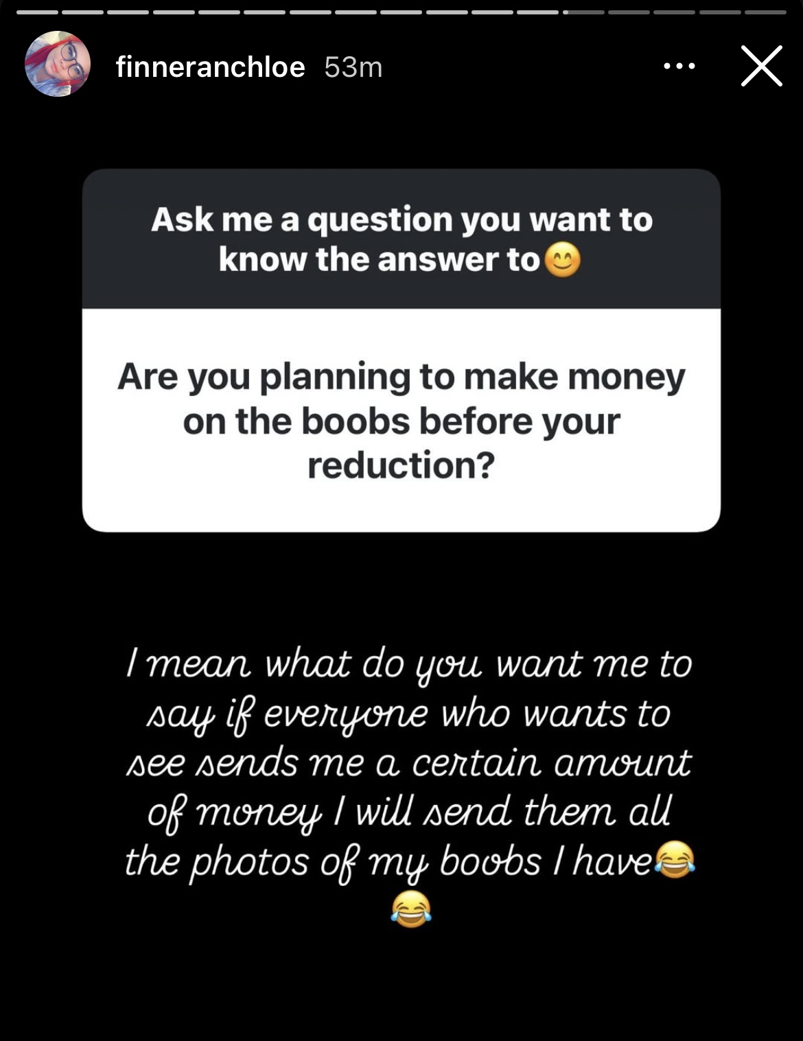 So apparently she has loads of photos of her boobs stowed away and has yet to settle on a price 😅