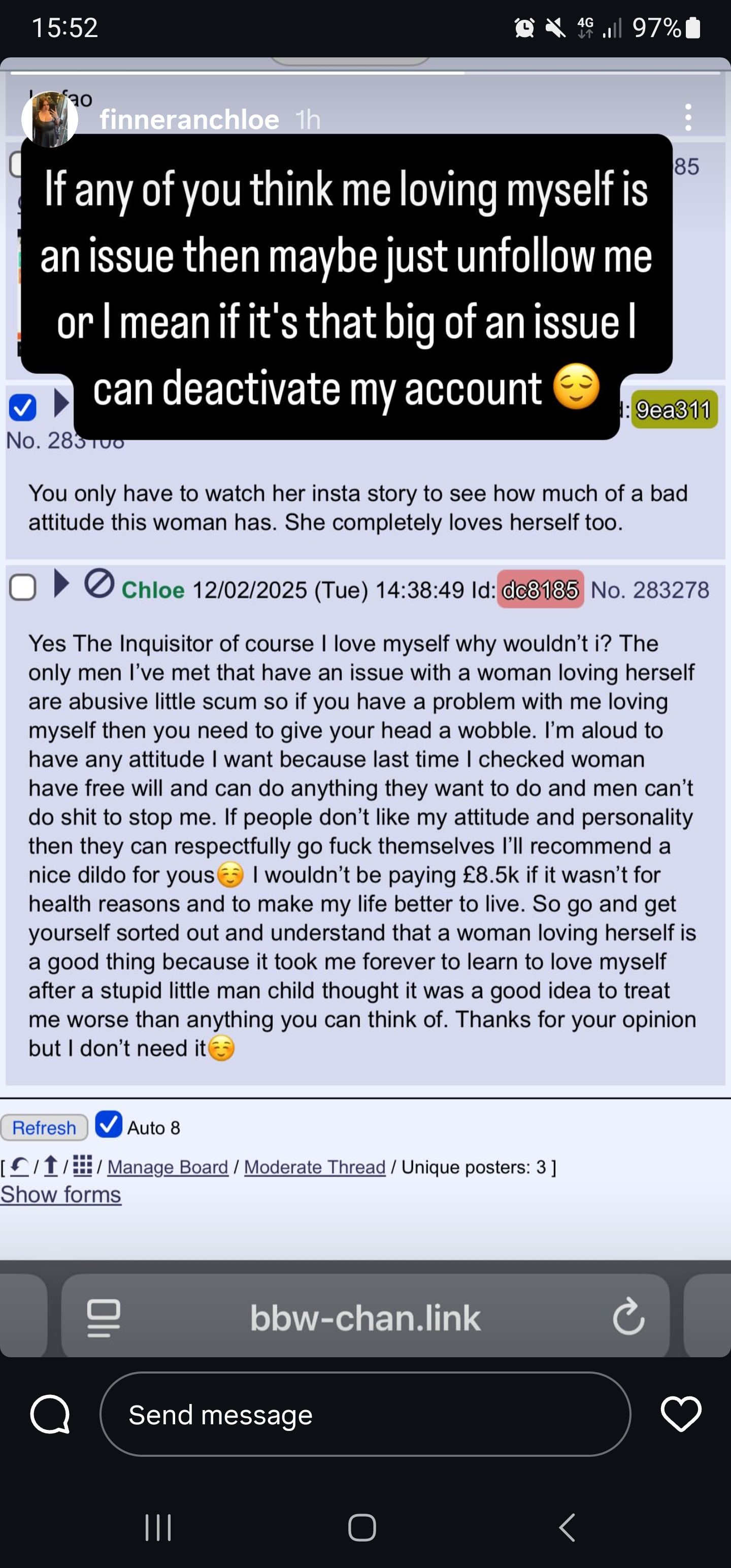 Yes The Inquisitor of course I love myself why wouldn’t i? The only men I’ve met that have an issue with a woman loving herself are abusive little scum so if you have a problem with me loving myself then you need to give your head a wobble. I’m aloud to have any attitude I want because last time I checked woman have free will and can do anything they want to do and men can’t do shit to stop me. If people don’t like my attitude and personality then they can respectfully go fuck themselves I’ll recommend a nice dildo for yous☺️ I wouldn’t be paying £8.5k if it wasn’t for health reasons and to make my life better to live. So go and get yourself sorted out and understand that a woman loving herself is a good thing because it took me forever to learn to love myself after a stupid little man child thought it was a good idea to treat me worse than anything you can think of. Thanks for your opinion but I don’t need it☺️